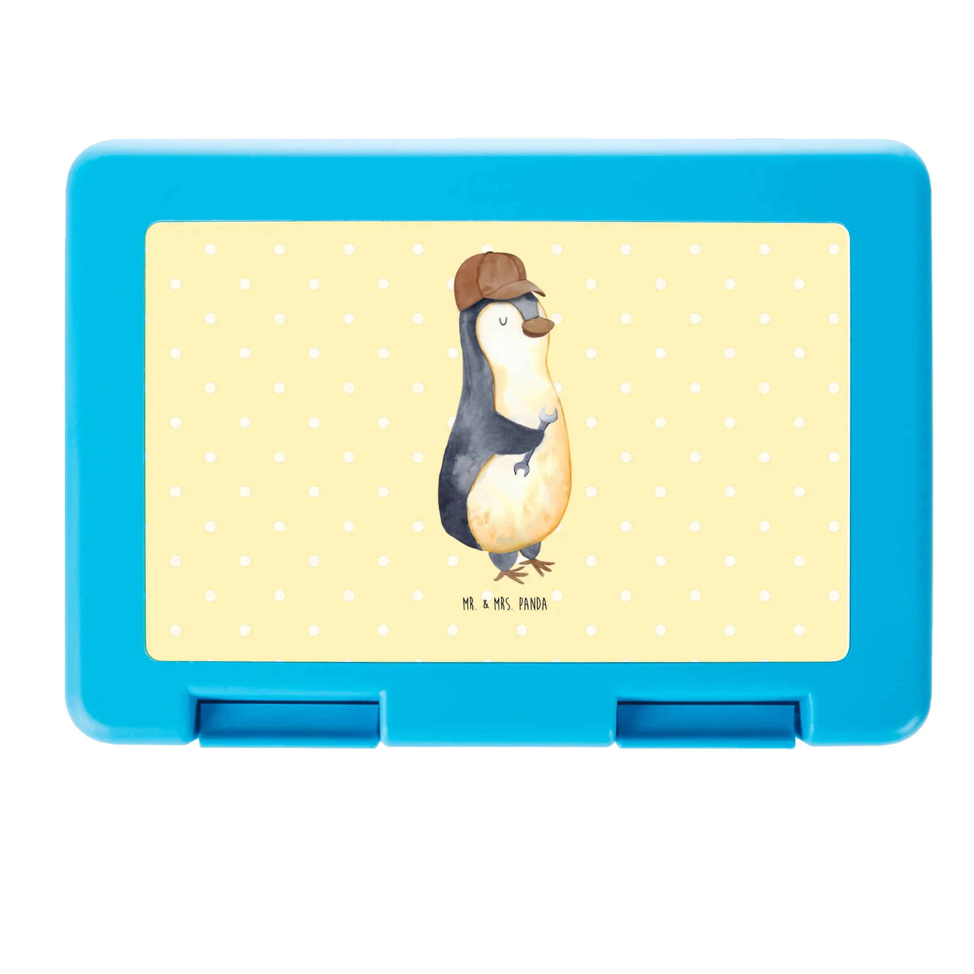 Diese liebevoll gestaltete Brotdose vereint Alltagstauglichkeit mit einem Augenzwinkern. Das fröhliche Motiv zeigt einen sympathischen Pinguin mit brauner Kappe und Schraubenschlüssel – ein perfektes Geschenk für Papa zum Vatertag oder einfach als kleine Überraschung für den besten Papa der Welt. Das Design stammt aus der Familien-Kollektion von Mr. & Mrs. Panda und wurde mit viel Liebe von Mrs. Panda als Aquarellmotiv entworfen.