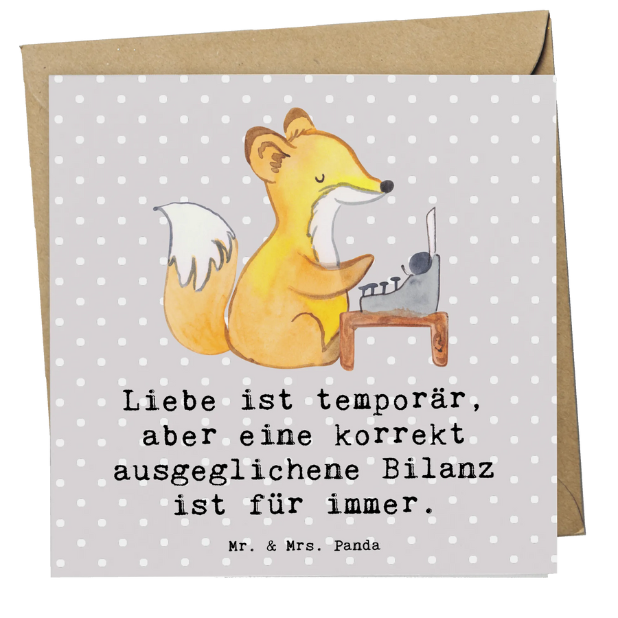Die Deluxe Karte für Buchhalter aus der liebevollen Berufe Kollektion von Mr. & Mrs. Panda ist das perfekte Geschenk für alle, die in der Welt der Zahlen und Finanzen zuhause sind. Diese hochwertige, quadratische Karte ist nicht nur ein simples Papierstück, sondern ein durchdachtes kleines Kunstwerk, das mit dem charmanten Spruch 'Liebe ist temporär, aber eine korrekt ausgeglichene Bilanz ist für immer' bedruckt ist.