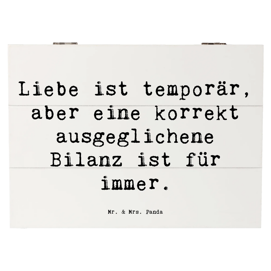 Die wunderschöne Holzkiste von Mr. & Mrs. Panda ist das ideale Geschenk für alle Buchhalter und Finanzexperten in Deinem Leben. Mit ihrer liebevollen Gestaltung, die das Motto "Liebe ist temporär, aber eine korrekt ausgeglichene Bilanz ist für immer" trägt, ist diese Kiste nicht nur ein praktischer Aufbewahrungsort für all Deine wichtigen Unterlagen, Rechnungen und Finanzberichte, sondern auch ein ganz persönliches Geschenk, das Herzen berührt.