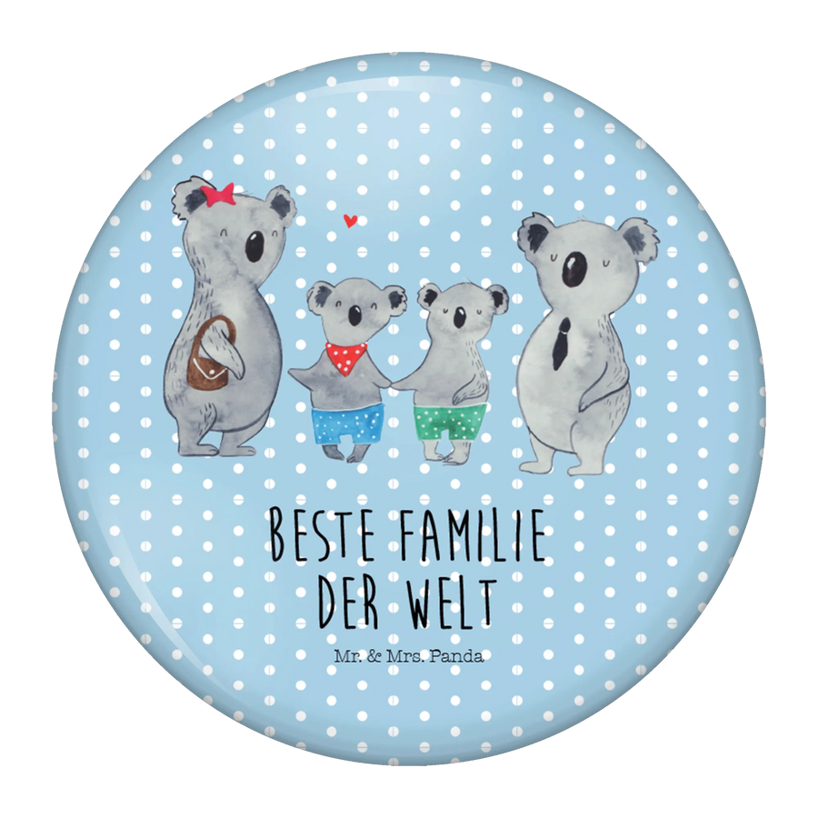 Auf dem Button siehst Du eine süße Familie von Koalabären, die in einer herzlichen und verspielten Darstellung präsentiert wird. Der größte Koala, der wie eine Mutterfigur wirkt, trägt ein rotes Sternchen im Haar und hält eine braune Tasche, während der Koala neben ihr ein rotes Halstuch trägt und eine fröhliche Pose einnimmt. Zwei kleine Koalas, die Kinder darstellen könnten, stehen zusammen in der Mitte und bringen mit ihren bunten Shorts in Blau und Grün das Familienleben zum Lächeln.