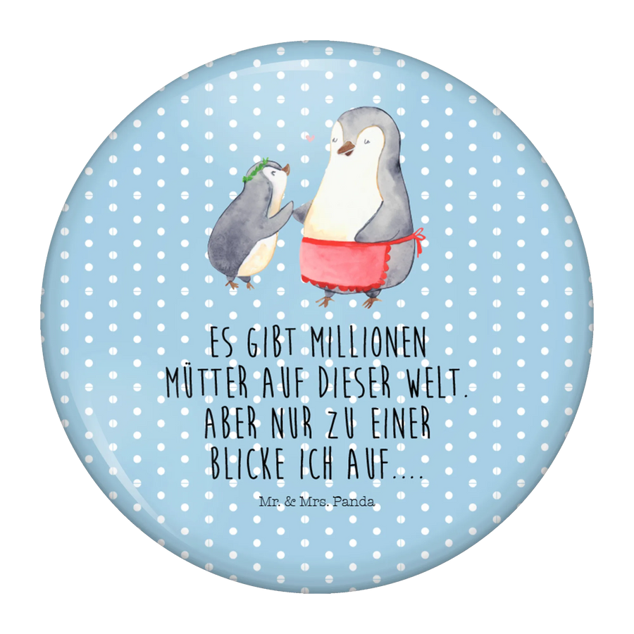 Der 50mm Button "Pinguin mit Kind" aus der Familienkollektion von Mr. & Mrs. Panda ist das perfekte Geschenk für Mama, Mami oder Mutti. Er zeigt eine herzerwärmende Szene, in der ein großer Pinguin mit roter Schürze voller Fürsorge zu einem kleinen Pinguin mit grünem Kranz herabblickt. Diese liebevolle Illustration symbolisiert die besondere Verbindung zwischen Eltern und Kind.