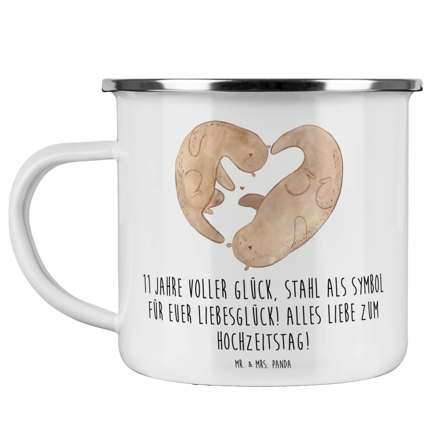 Wenn Du auf der Suche nach dem perfekten Geschenk für den 11. Hochzeitstag bist, dann ist die Camping Emaille Tasse von Mr. & Mrs. Panda genau das Richtige für Dich! Mit dem liebevollen Motiv "11 Jahre voller Glück, Stahl als Symbol für euer Liebesglück! Alles Liebe zum Hochzeitstag!" wird diese Tasse zum idealen Begleiter für all Deine Abenteuer in der Natur und ein ganz besonderes Erinnerungsstück an euren großen Tag.