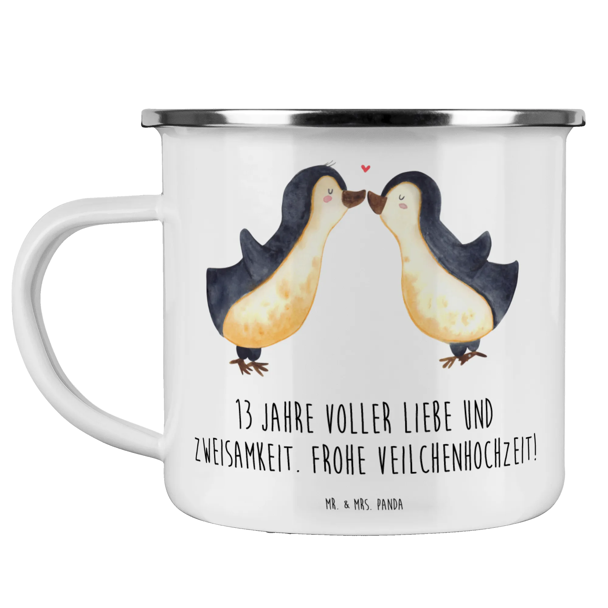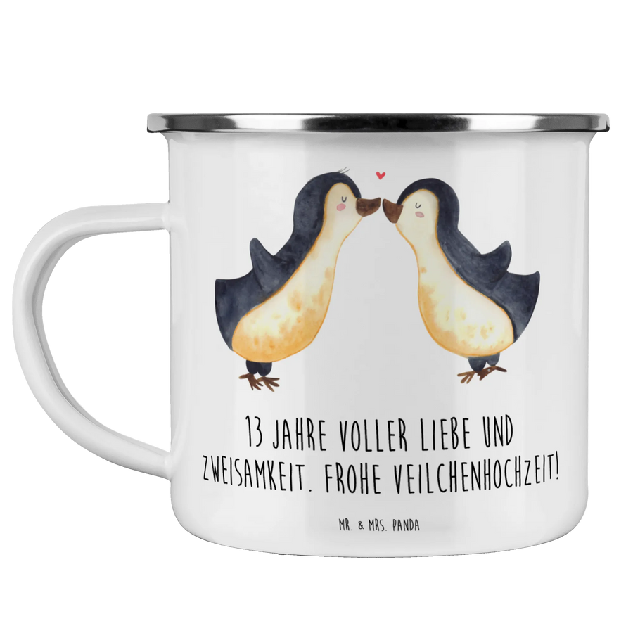 Entdecke die zauberhafte Camping Emaille Tasse von Mr. & Mrs. Panda, die perfekt zu eurer 13. Hochzeitstag Feierei passt! Mit dem liebevollen Spruch "13 Jahre voller Liebe und Zweisamkeit. Frohe Veilchenhochzeit!" bringt diese Tasse nicht nur Freude, sondern auch ein Stück eurer gemeinsamen Erinnerungen in die Natur.