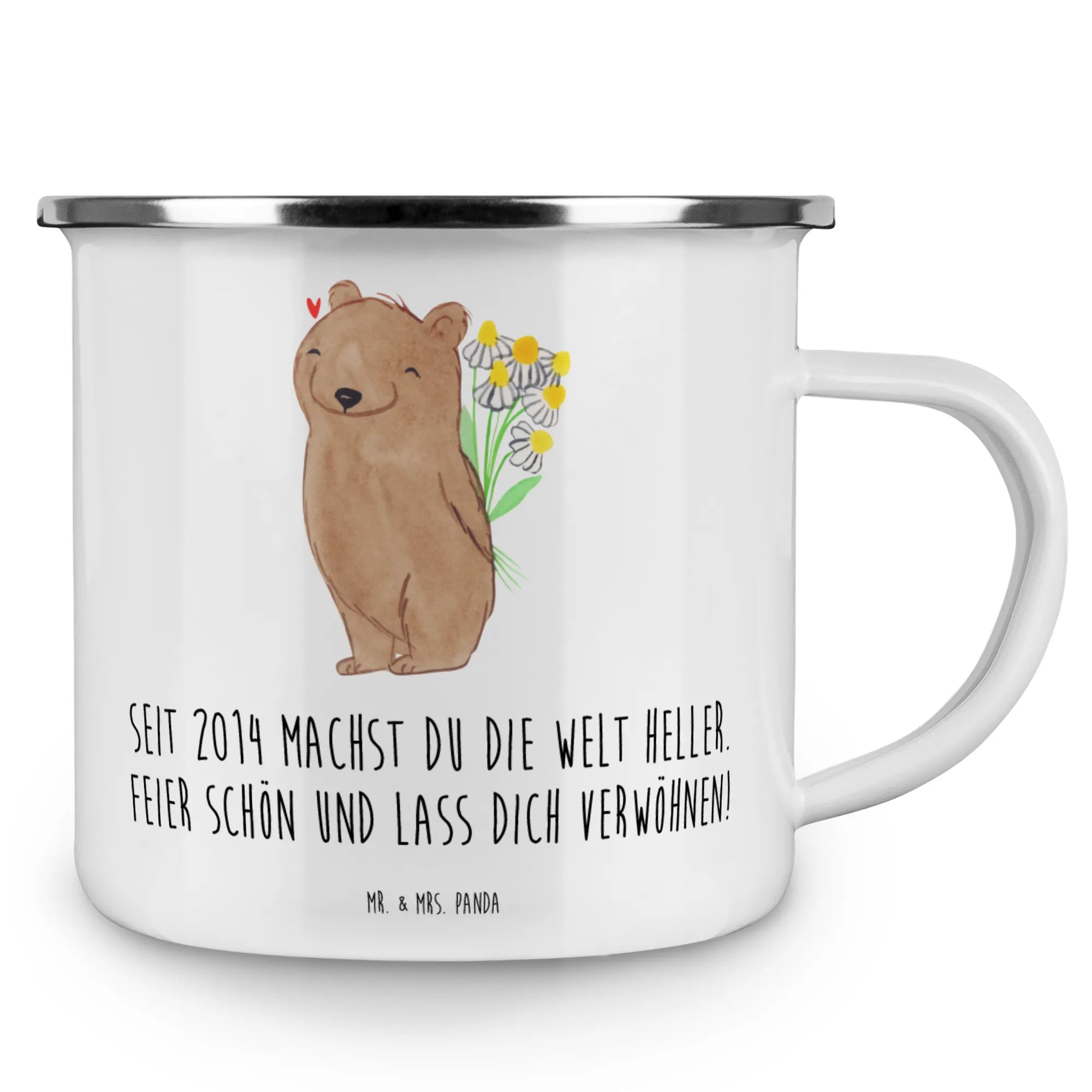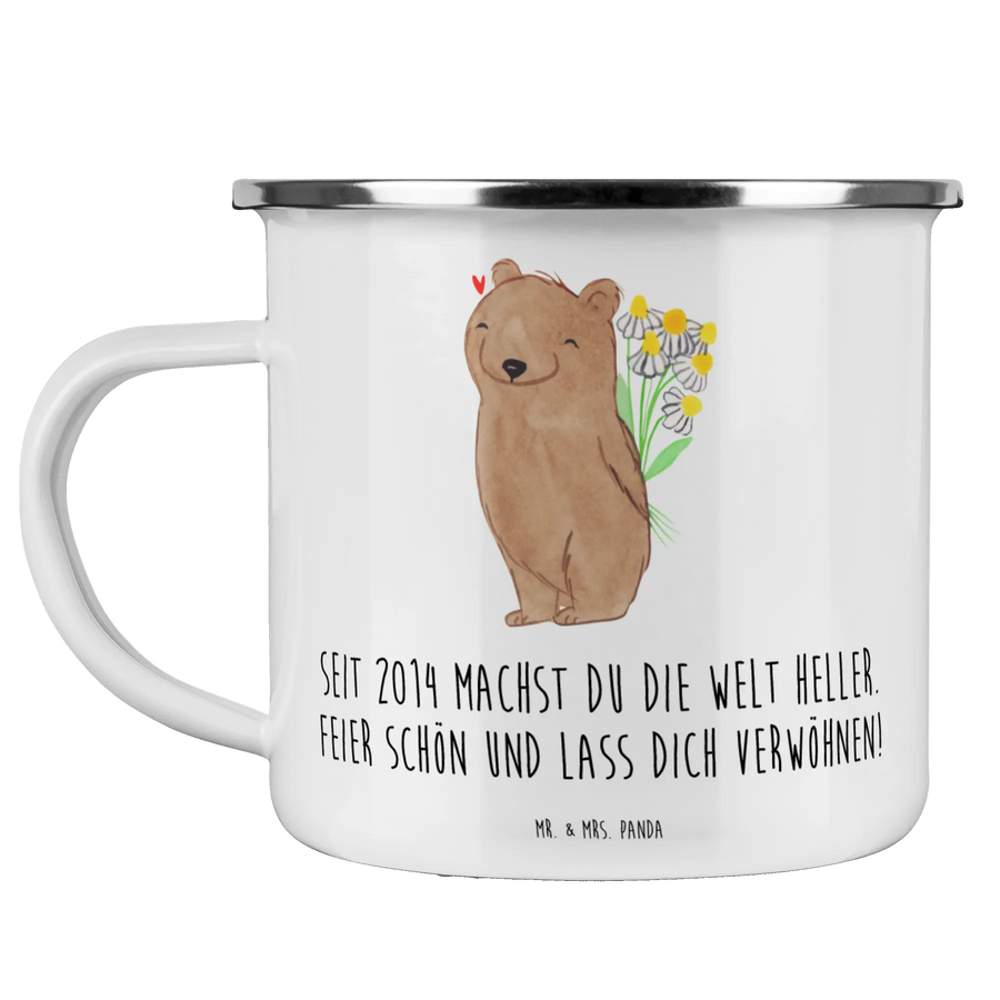 Die Camping Emaille Tasse mit dem wunderschönen Motiv "2014 Geburtstag" von Mr. & Mrs. Panda ist das perfekte Geschenk für all jene, die einen besonderen Geburtstag feiern möchten. Diese Tasse, die mit dem liebevollen Spruch "Seit 2014 machst du die Welt heller. Feier schön und lass dich verwöhnen!" bedruckt ist, eignet sich ideal für Naturfreunde, Campingliebhaber und Abenteurer. Die Tasse hat eine Füllmenge von 300 ml und ist aus kratzfester Emaille gefertigt, was sie besonders langlebig und resistent gegen Korrosion macht.