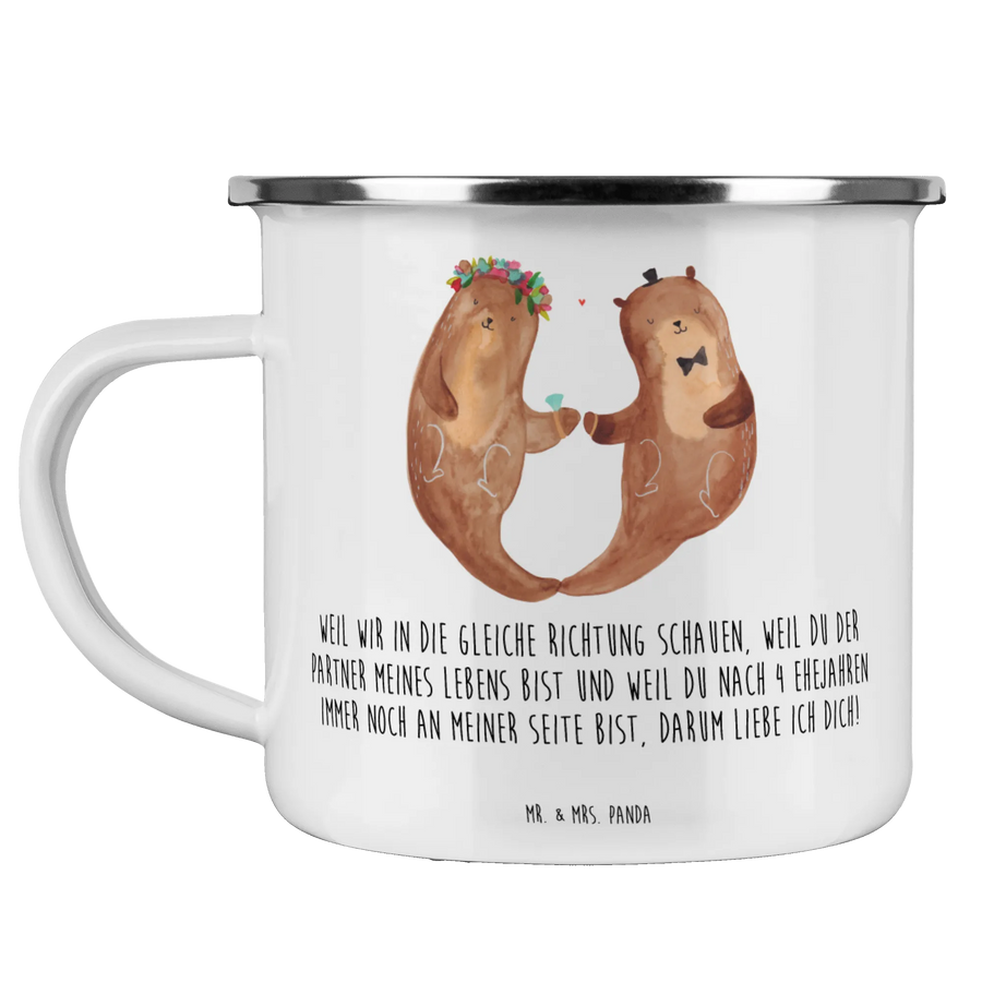 Die Camping Emaille Tasse "4. Hochzeitstag Seidenhochzeit" von Mr. & Mrs. Panda ist das perfekte Geschenk für Paare, die ihren vierten Hochzeitstag feiern möchten. Mit einem wunderschönen Spruch, der das besondere Band zwischen zwei Menschen würdigt, ist diese Tasse nicht nur ein praktisches Accessoire für die gemeinsame Zeit beim Camping oder Wandern, sondern auch ein liebevoll gestaltetes Erinnerungsstück. Der Spruch "Weil wir in die gleiche Richtung schauen, weil du der Partner meines Lebens bist und weil du nach 4 Ehejahren immer noch an meiner Seite bist, darum liebe ich dich!" wird jedes Mal ins Herz treffen, wenn der Partner die Tasse in den Händen hält.