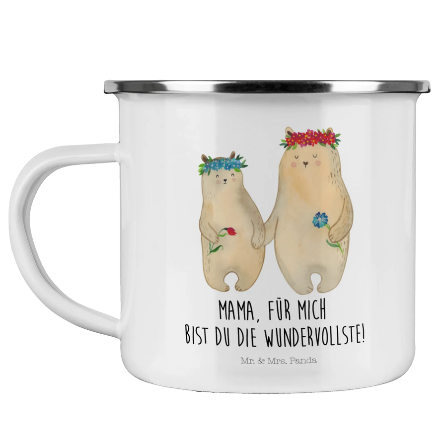 Die Camping Emaille Tasse "Bären mit Blumenkranz" von Mr. & Mrs. Panda ist das perfekte Geschenk für alle, die das Abenteuer in der Natur lieben und gleichzeitig Wert auf Stil legen.