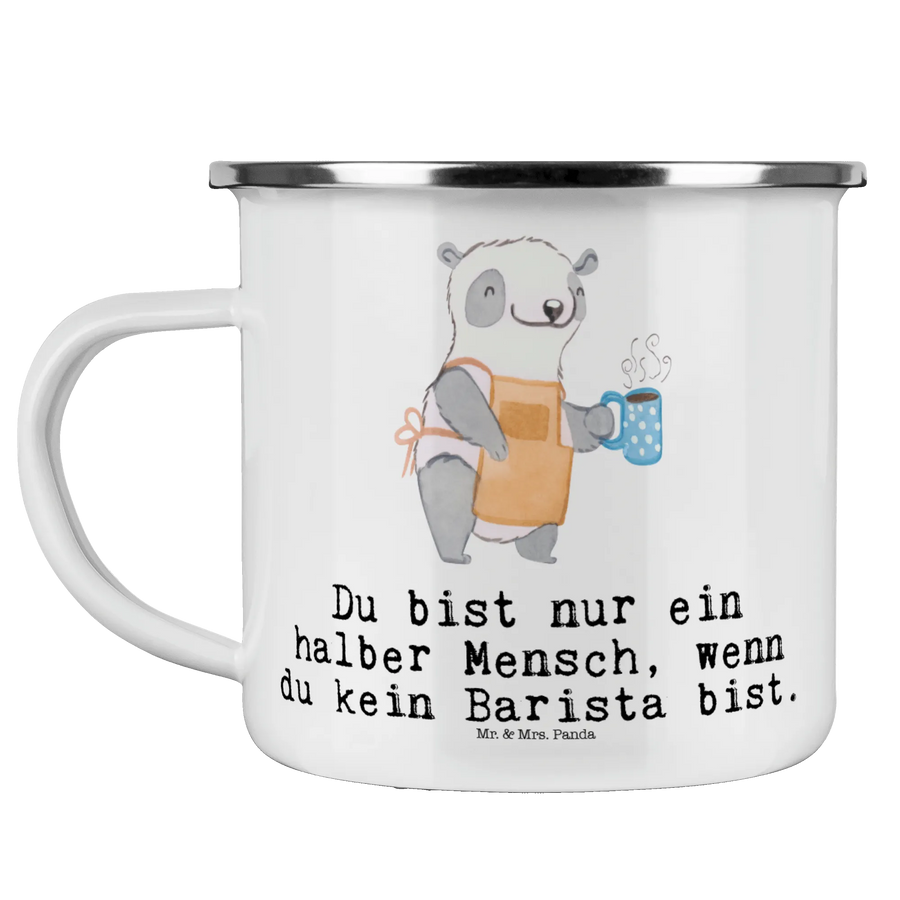 Die Camping Emaille Tasse "Barista mit Herz" von Mr. & Mrs. Panda ist das perfekte Geschenk für alle, die die Kunst des Kaffeekochens lieben und gerne Zeit in der Natur verbringen. Diese liebevoll gestaltete Tasse ist nicht nur ein praktisches Accessoire für deine nächsten Outdoor-Abenteuer, sondern auch ein tolles Erinnerungsstück für Baristas und Kaffeeliebhaber. Mit dem Slogan "Du bist nur ein halber Mensch, wenn du kein Barista bist." bringt sie ein Lächeln auf jedes Gesicht.