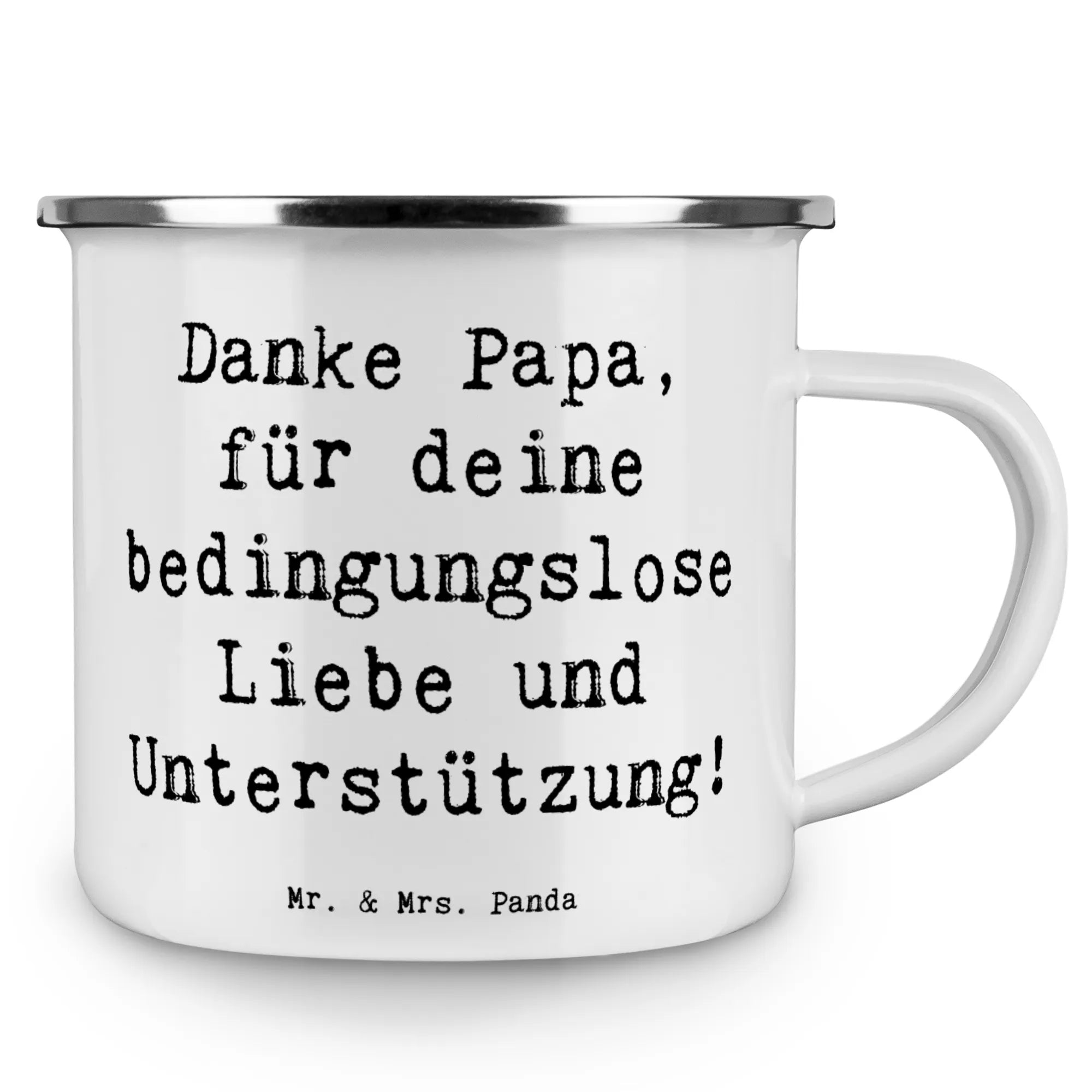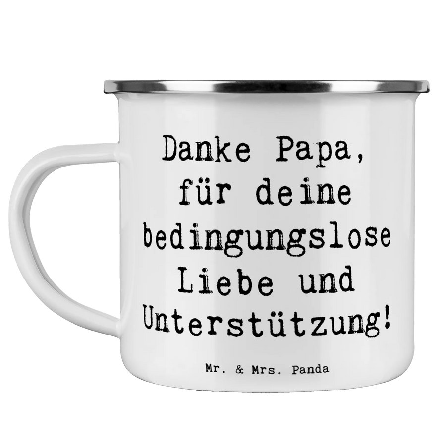 Die Camping Emaille Tasse mit dem liebevollen Motiv "Danke Papa, für deine bedingungslose Liebe und Unterstützung!" von Mr. & Mrs. Panda ist das perfekte Geschenk für all die Väter, die dir als Begleiter, Unterstützer und Freund zur Seite standen.