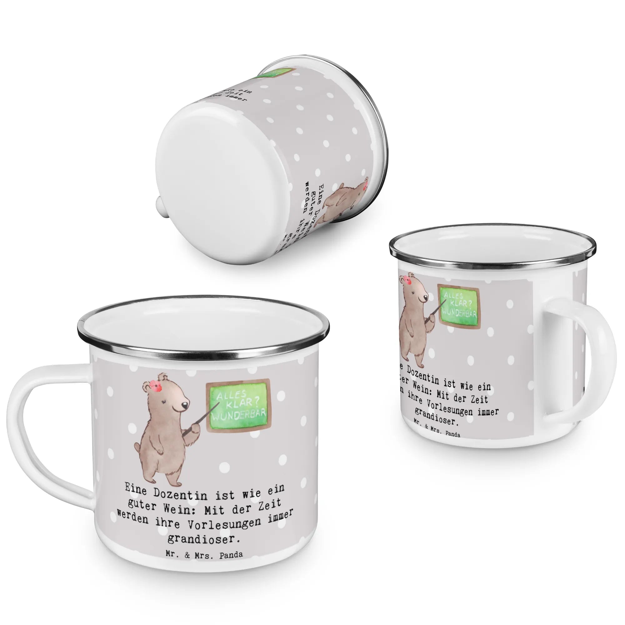 Die Dozentin Tasse aus der Berufe Kollektion von Mr. & Mrs. Panda ist die ideale Geschenkidee zum Lehrertag, zum Berufswechsel oder einfach nur, um einer besonderen Person Danke zu sagen. Mach einer Dozentin eine Freude und schenk ihr diese wunderschöne Emaille Camping Tasse, die ihre Leidenschaft für das Lehren in die Natur begleiten kann.