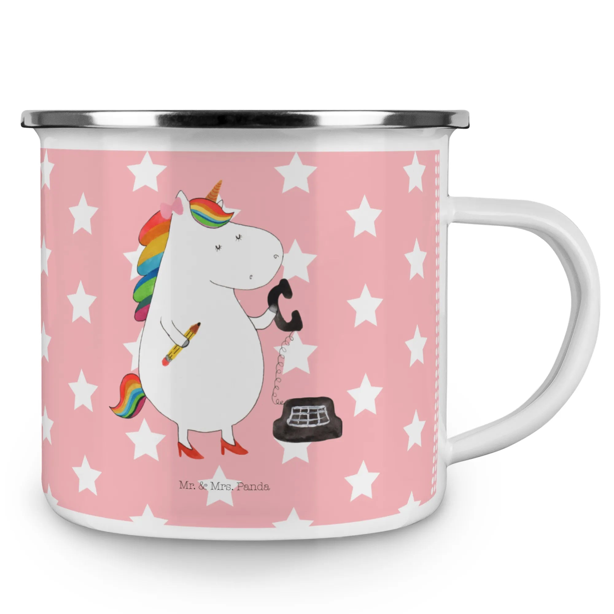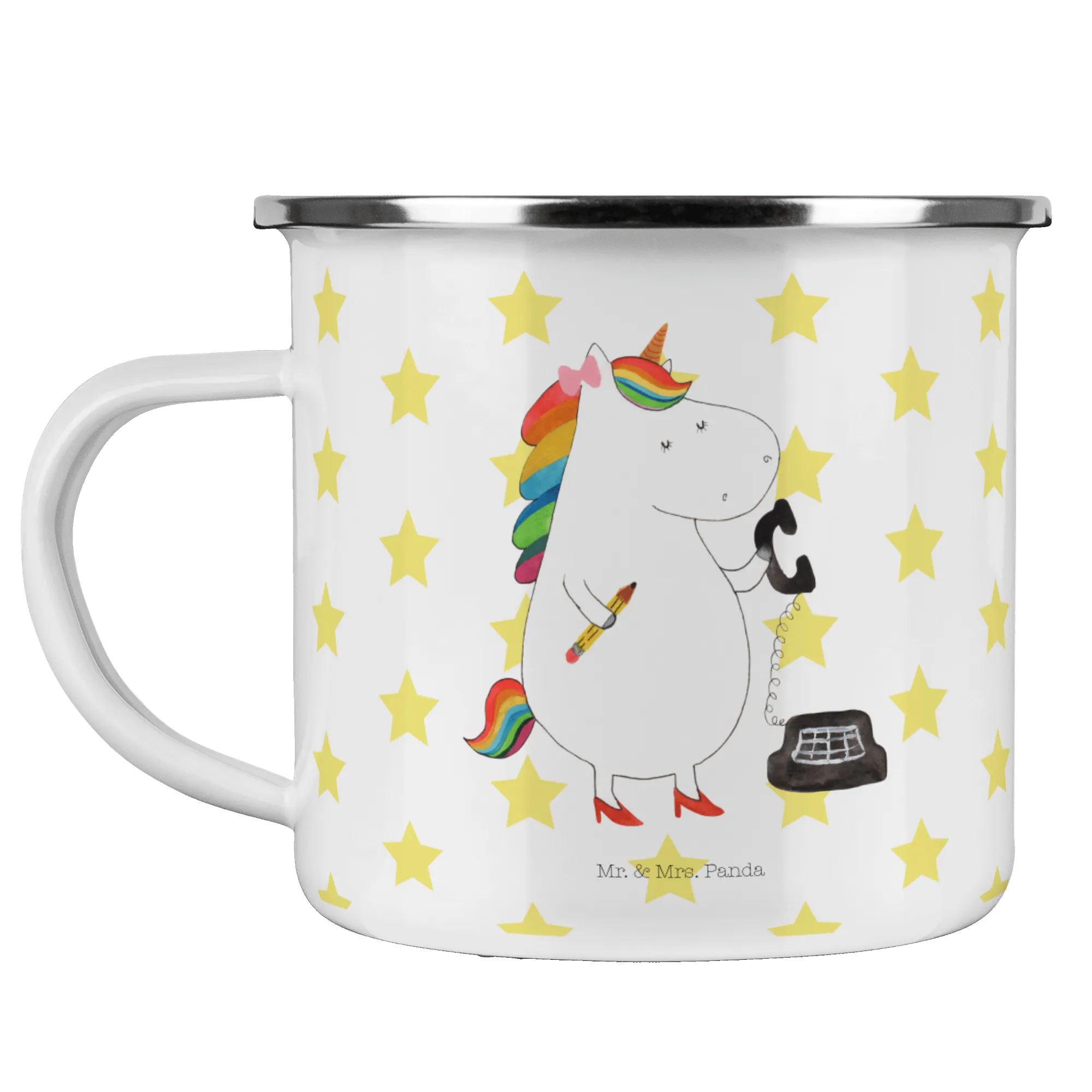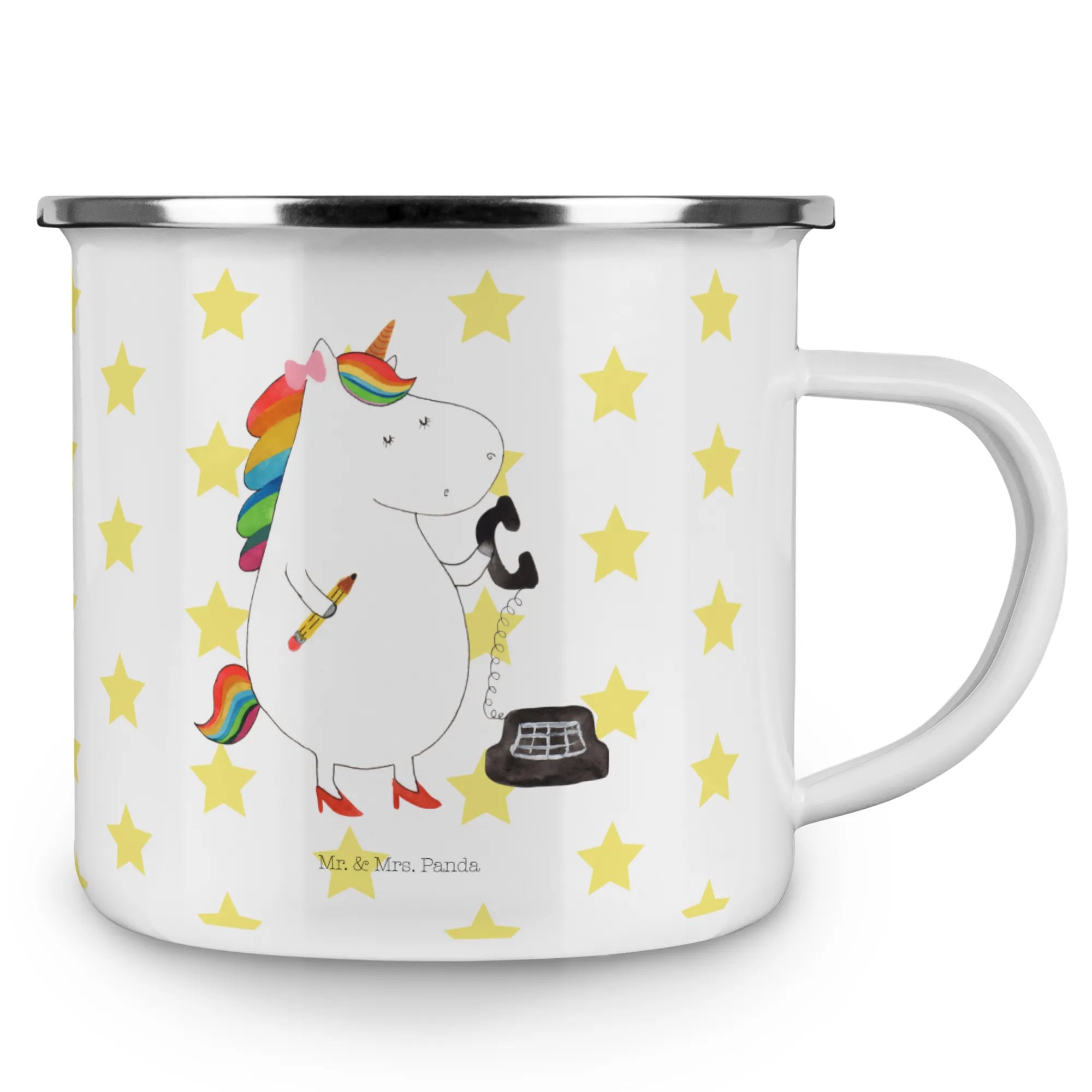 Mit der Camping Emaille Tasse Einhorn Sekretärin aus der bezaubernden Einhorn-Kollektion von Mr. & Mrs. Panda machst du jedem eine Freude – egal ob zum Geburtstag, als kleines Dankeschön oder einfach so, um jemandem den Tag zu verschönern!