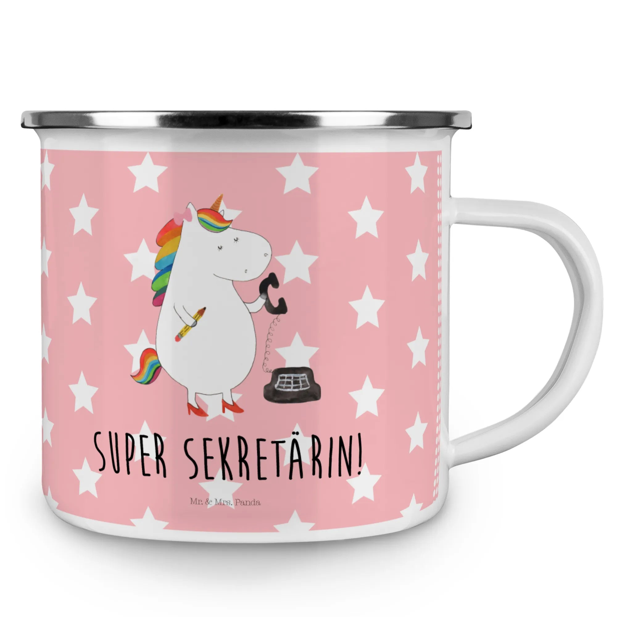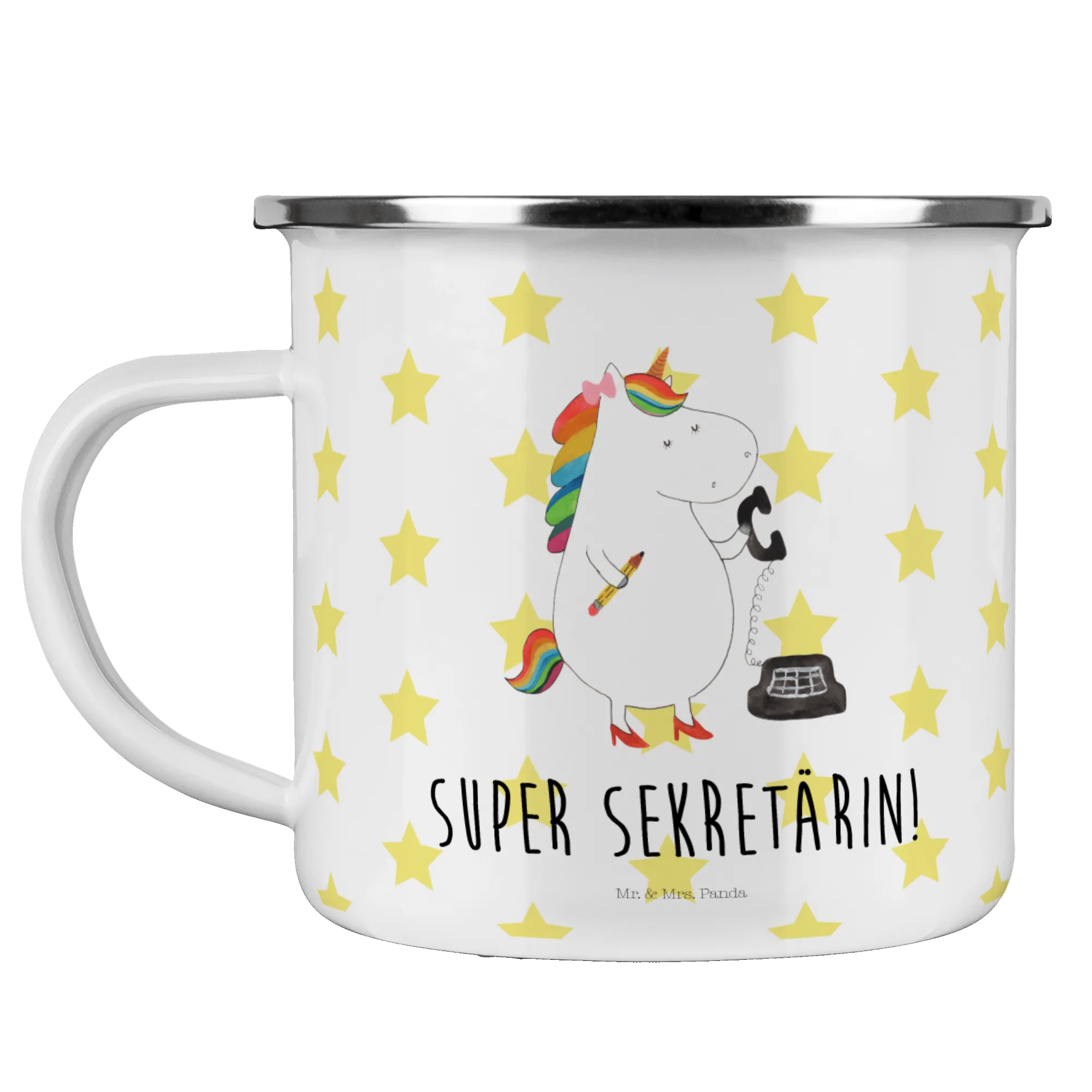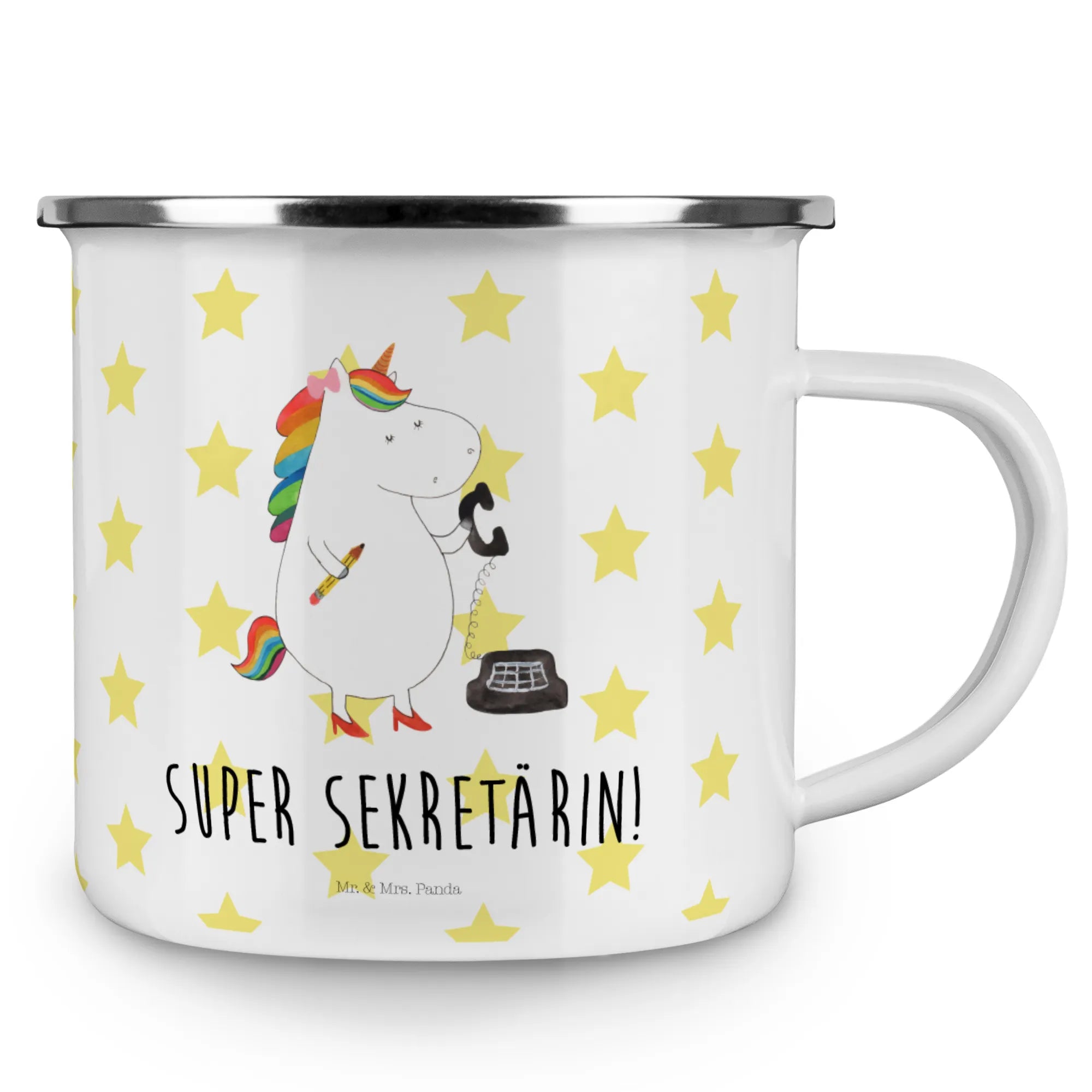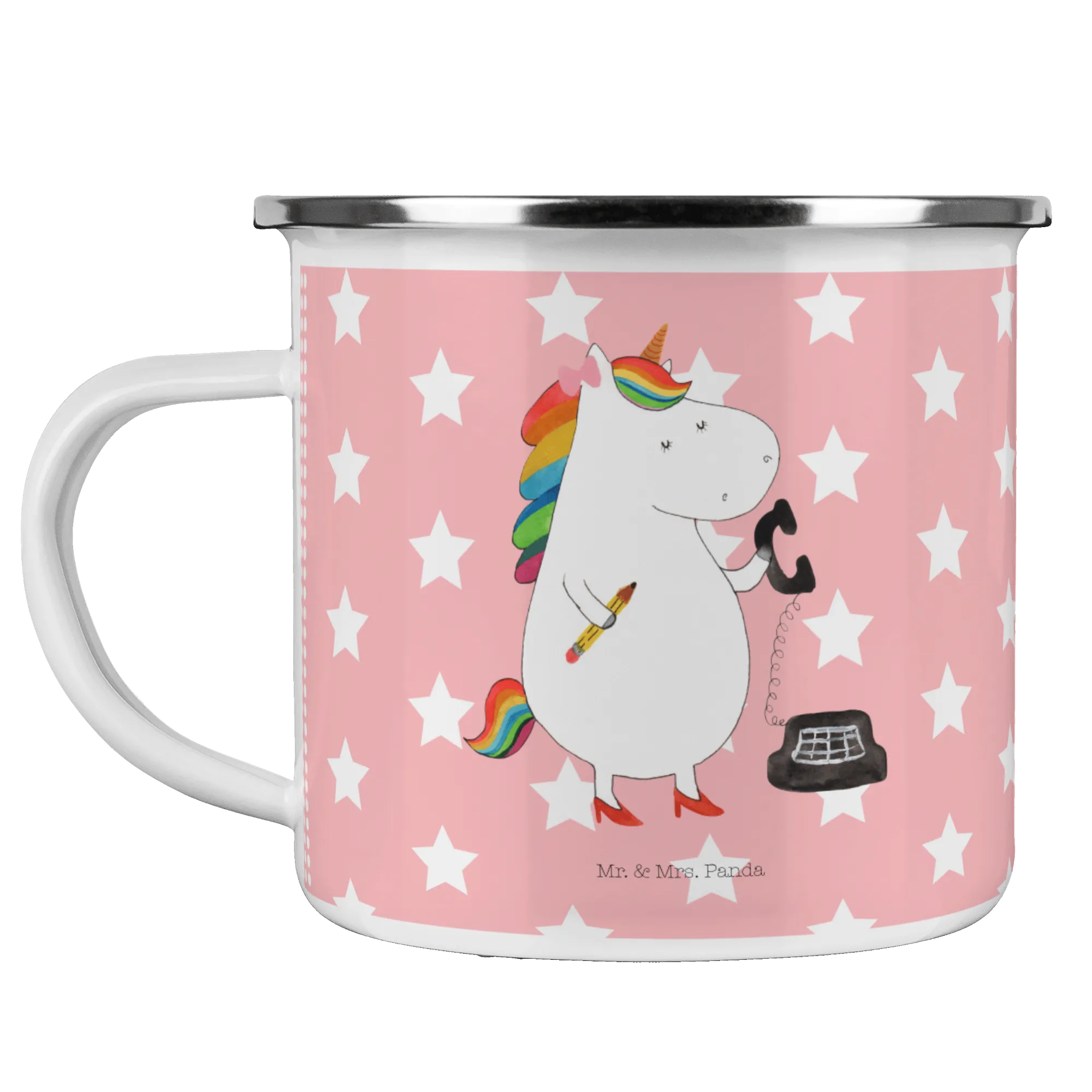 Mit der Camping Emaille Tasse Einhorn Sekretärin aus der bezaubernden Einhorn-Kollektion von Mr. & Mrs. Panda machst du jedem eine Freude – egal ob zum Geburtstag, als kleines Dankeschön oder einfach so, um jemandem den Tag zu verschönern!