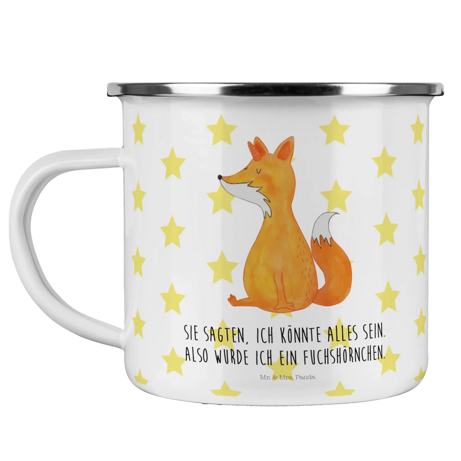 Entdecke die bezaubernde Camping Emaille Tasse mit dem niedlichen Fuchshörnchen-Motiv aus der Einhorn-Kollektion von Mr. & Mrs. Panda!