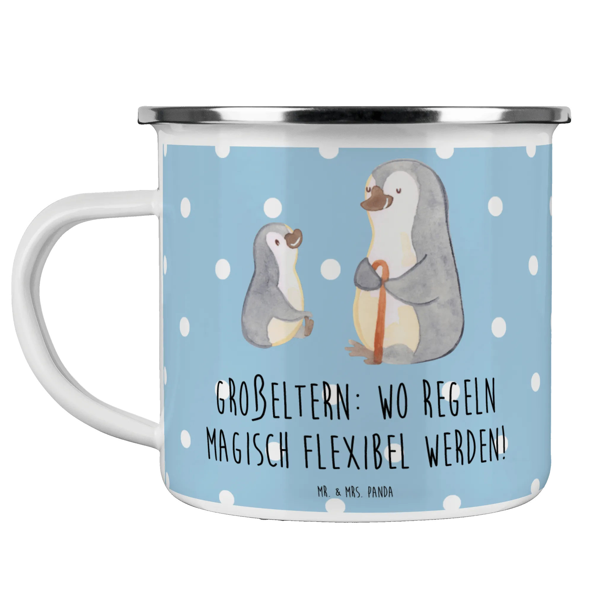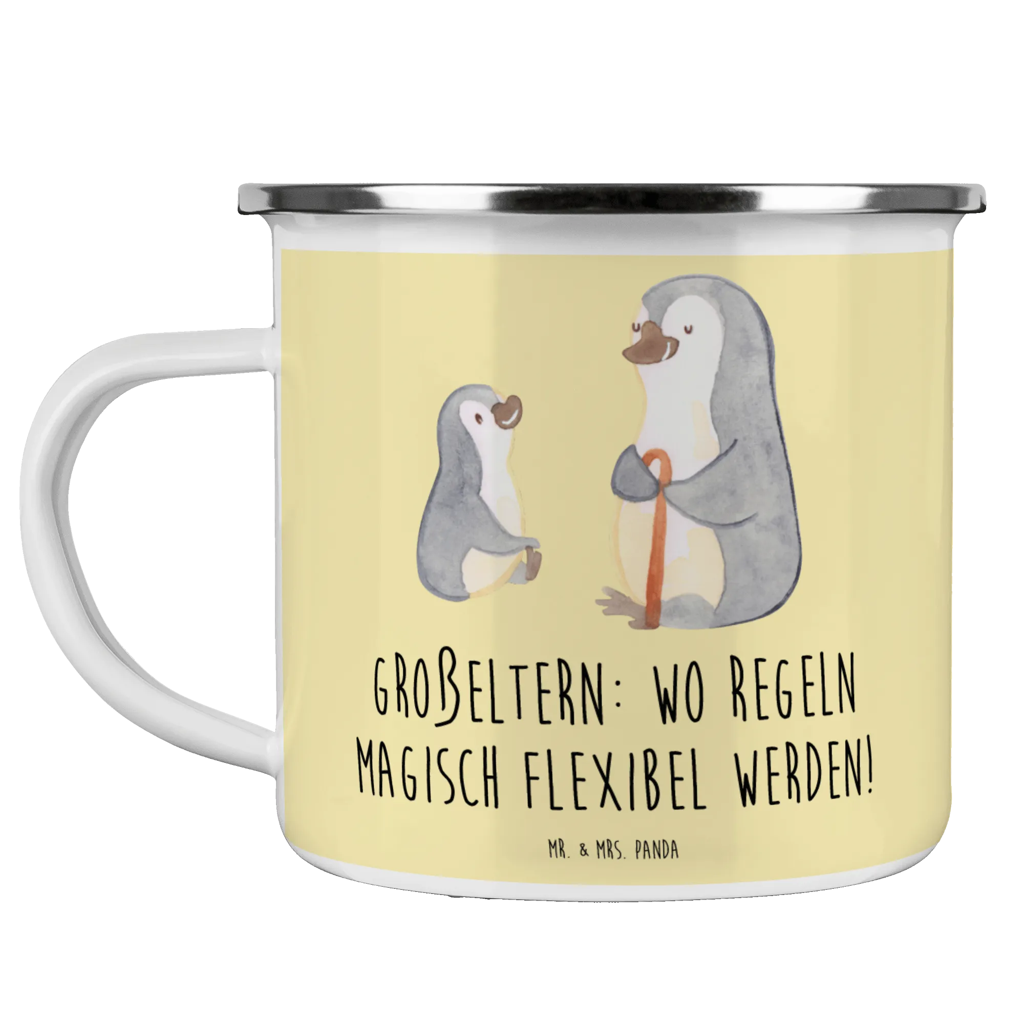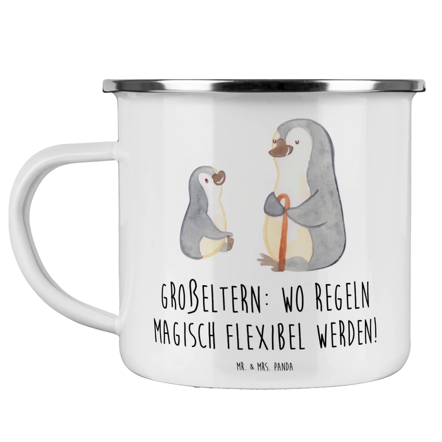 Die perfekte Camping Emaille Tasse von Mr. & Mrs. Panda für alle Großeltern! Mit einem liebevollen Spruch "Großeltern: wo Regeln magisch flexibel werden!" bringt diese Tasse nicht nur Freude beim Trinken, sondern ist auch ein wunderbares Geschenk für die ganze Familie.