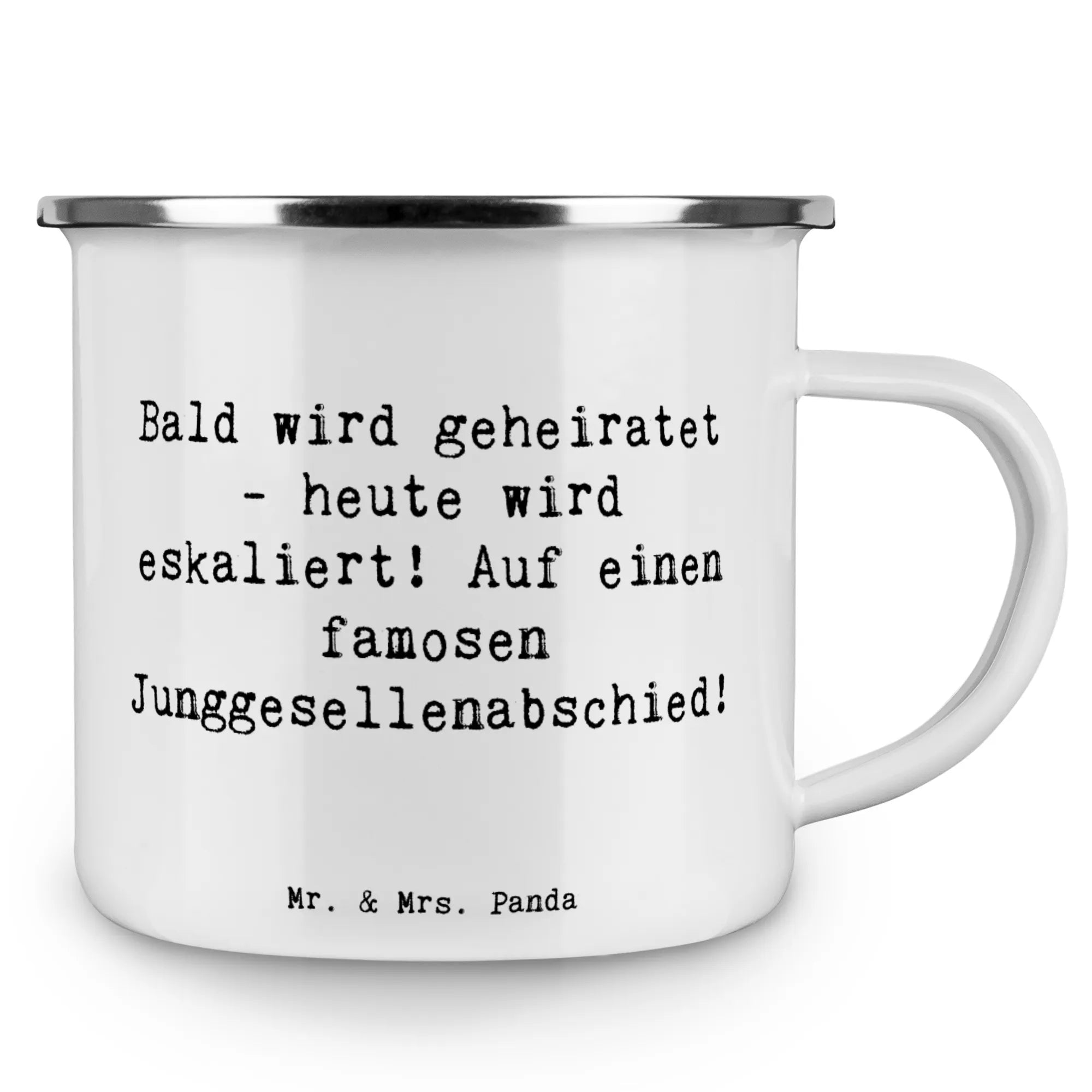 Die wunderschöne Camping Emaille Tasse von Mr. & Mrs. Panda ist das perfekte Geschenk für einen unvergesslichen Junggesellenabschied! Bedruckt mit dem witzigen Spruch "Bald wird geheiratet - heute wird eskaliert! Auf einen famosen Junggesellenabschied!", bringt diese Tasse nicht nur gute Laune, sondern auch ein Stück Erinnerung an diesen einmaligen Tag.