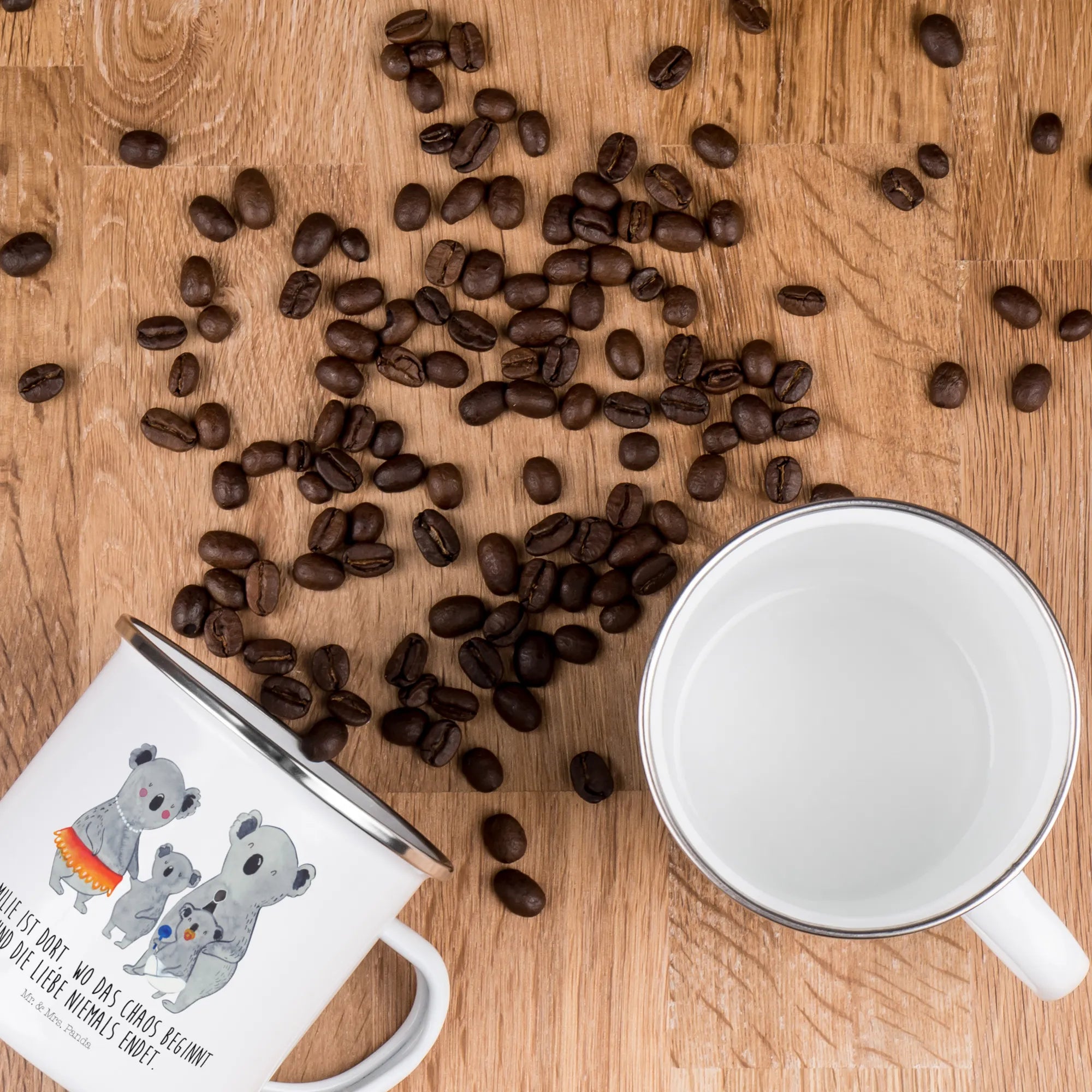 Das süße Design zeigt eine Koala Familie, die aus zwei größeren und zwei kleineren Koalas besteht. Diese haben menschliche Züge und Accessoires, was zu einem warmen, einladenden Familiengefühl führt. Und das Beste? Dieser bezaubernde Emaille Becher ist mit dem liebevollen Spruch „Familie ist dort, wo das Chaos beginnt und die Liebe niemals endet“ verziert und bringt so ein Lächeln auf jedes Gesicht.