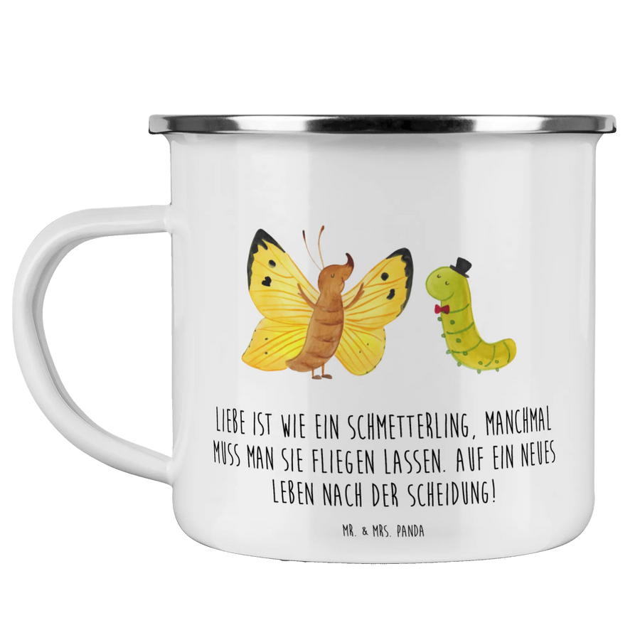 Die Camping Emaille Tasse von Mr. & Mrs. Panda ist mehr als nur ein Trinkbehälter – sie ist der perfekte Begleiter für jeden, der das Leben im Freien liebt. Wenn Du einen Kaffee am Lagerfeuer genießen oder einen warmen Tee während Deiner Wanderung trinken möchtest, die robuste und gleichzeitig stylishe Tasse garantiert, dass Deine Getränke immer in bestem Zustand bleiben. Diese bezaubernde Metalltasse, bedruckt mit dem besonderen Spruch 'Liebe ist wie ein Schmetterling, manchmal muss man sie fliegen lassen. Auf ein neues Leben nach der Scheidung!', ist ideal geeignet, um positive Gedanken zu verbreiten und die gute Laune zu fördern, während Du die Natur erkundest.