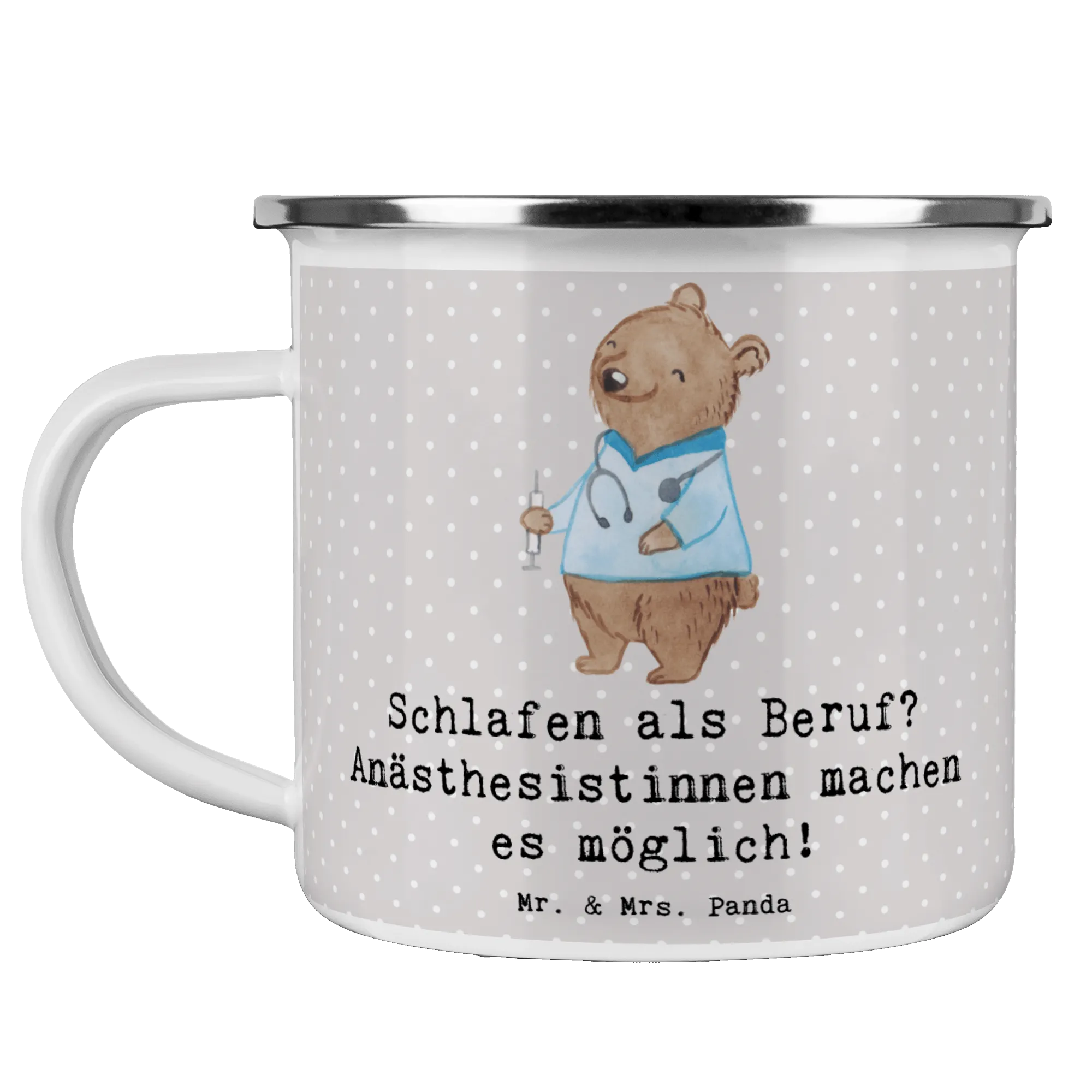 Die Camping Emaille Tasse mit dem coolen Motiv "Anästhesistin" von Mr. & Mrs. Panda ist das perfekte Geschenk für alle, die im Gesundheitswesen arbeiten oder einfach eine Schwäche für ein gutes Büro-Lächeln haben!