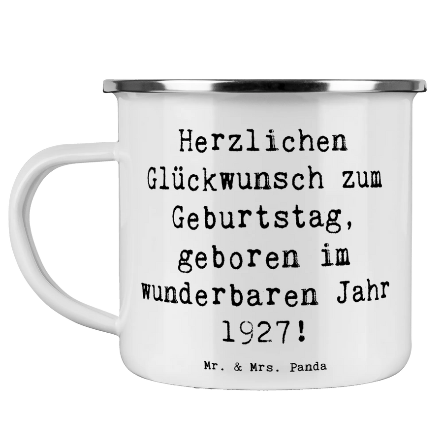 Die Camping Emaille Tasse "Herzlichen Glückwunsch zum Geburtstag, geboren im wunderbaren Jahr 1927!" von Mr. & Mrs. Panda ist das perfekte Geschenk für alle, die in diesem Jahr ihren besonderen Tag feiern. Sie ist nicht nur ein schöner Hingucker, sondern auch extrem praktisch! Mit einer Füllmenge von 300 ml bietet sie genug Platz für alles, was Du am Lagerfeuer oder beim Picknick genießen möchtest – sei es eine heiße Schokolade, ein frisch gebrühter Kaffee oder ein erfrischender Tee.