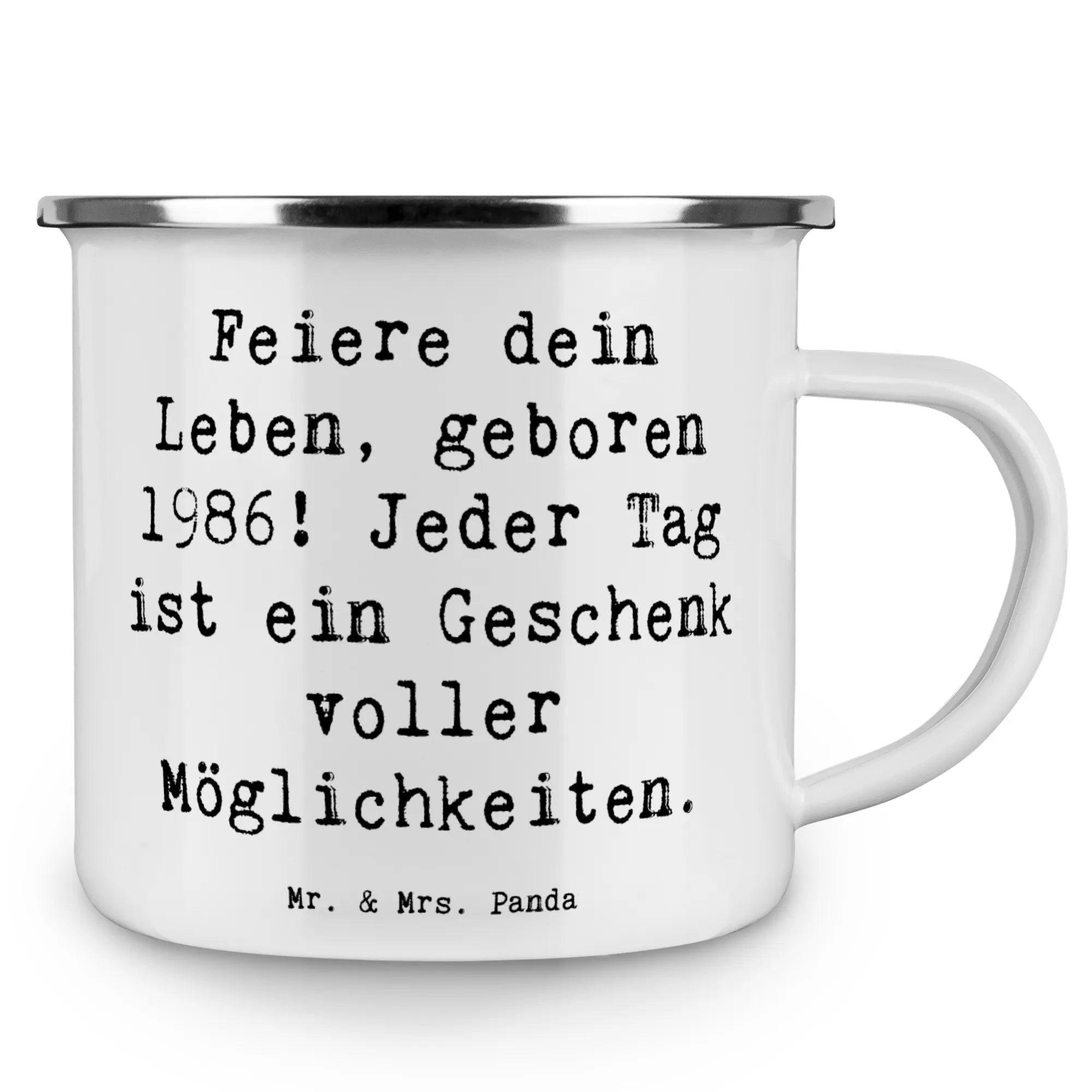 Entdecke die perfekte Camping Emaille Tasse von Mr. & Mrs. Panda, die nicht nur als praktischer Begleiter für all deine Abenteuer gedacht ist, sondern auch ein wunderschönes Geburtstagsgeschenk für alle, die 1986 geboren wurden!