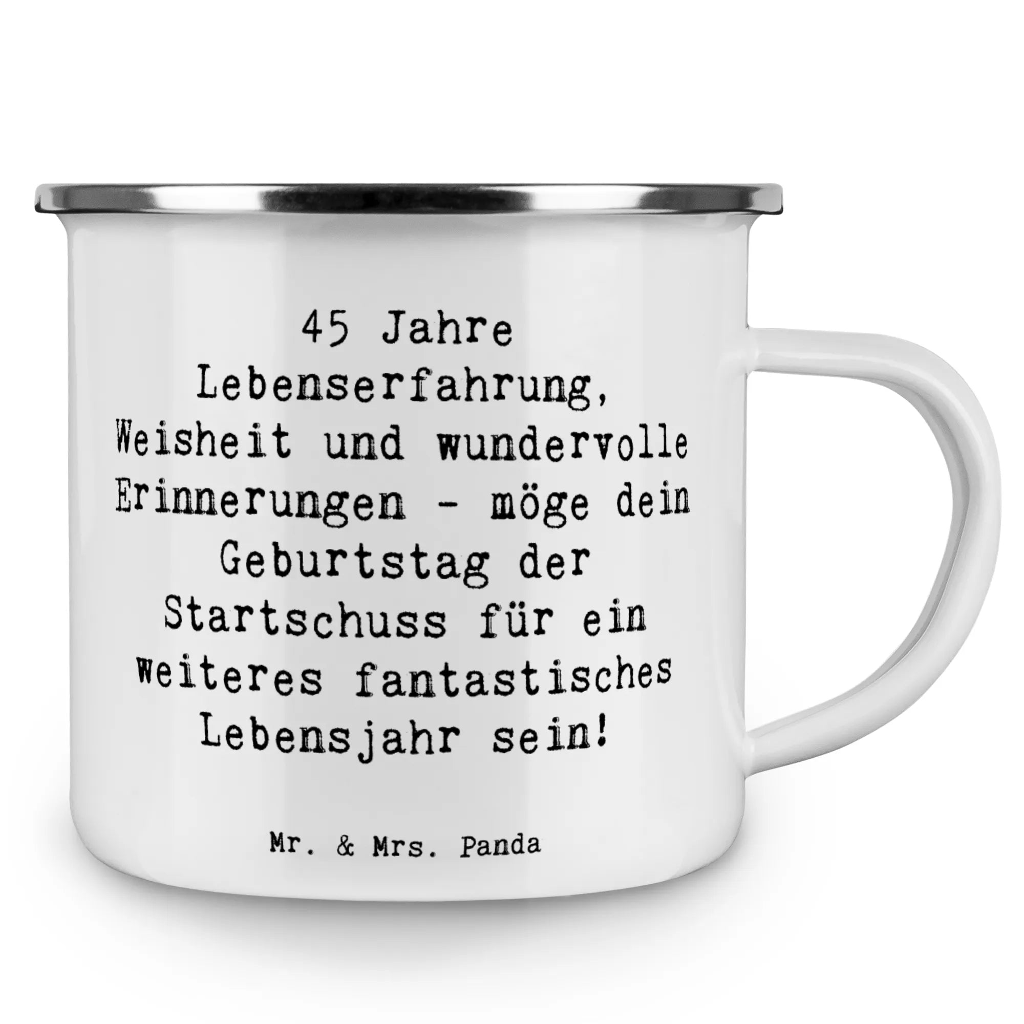 Die Camping Emaille Tasse von Mr. & Mrs. Panda ist das perfekte Geschenk für alle, die ihren 45. Geburtstag gebührend feiern möchten! Mit dem liebevollen Motiv und dem Spruch "45 Jahre Lebenserfahrung, Weisheit und wundervolle Erinnerungen - möge dein Geburtstag der Startschuss für ein weiteres fantastisches Lebensjahr sein!" ist sie nicht nur eine praktische Beigabe beim nächsten Campingausflug, sondern auch eine wunderschöne Erinnerung. Gefertigt aus kratzfester Emaille, überzeugt diese Tasse mit ihrer hohen Resistenz gegen Korrosion und ist der ideale Begleiter für heiße sowie kalte Getränke.