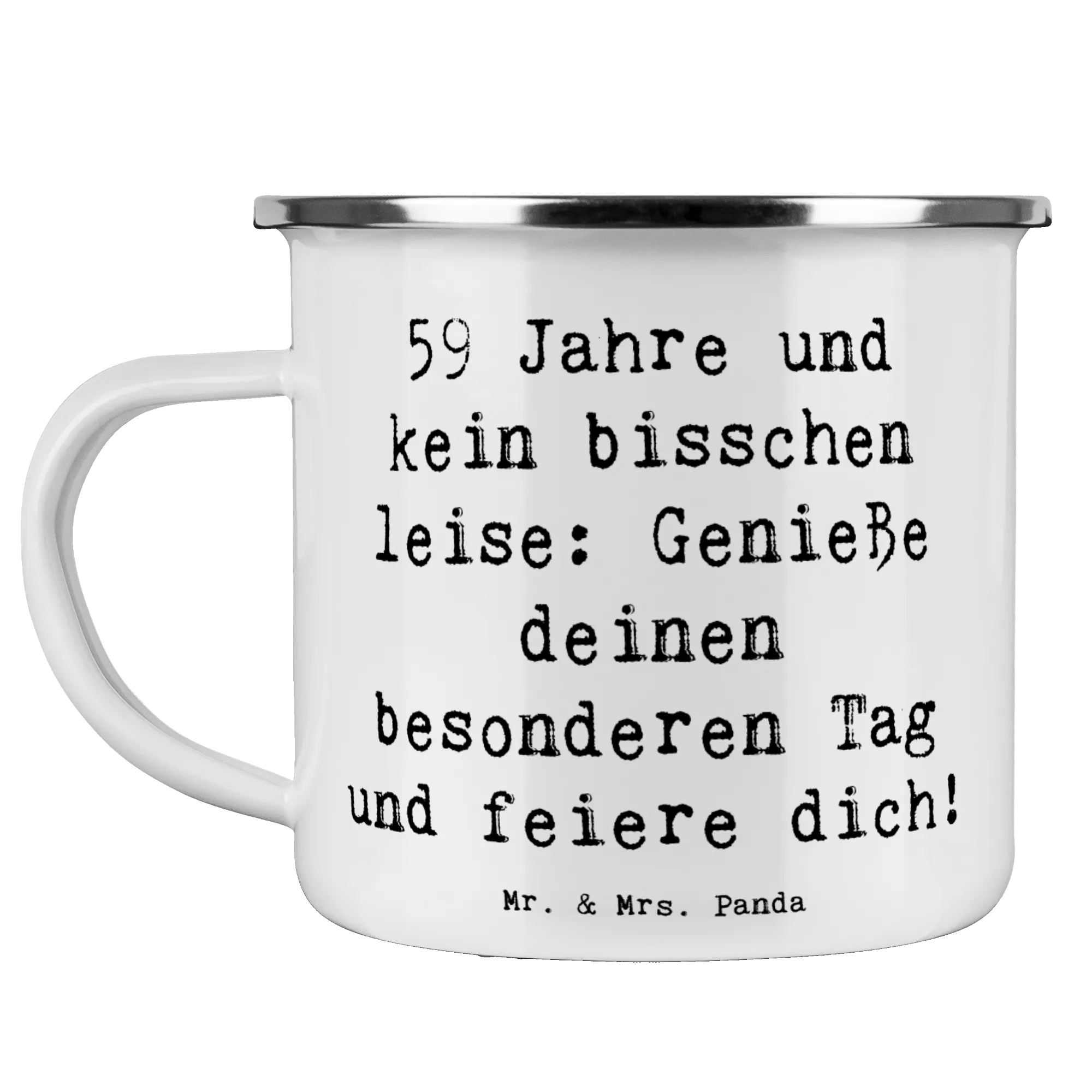 Die Camping Emaille Tasse von Mr. & Mrs. Panda ist das perfekte Geschenk zum 59. Geburtstag! Mit dem fröhlichen Spruch "59 Jahre und kein bisschen leise: Genieße deinen besonderen Tag und feiere dich!" bringt sie garantiert ein Lächeln auf die Gesichter der Beschenkten. Diese hochwertige Metalltasse, gefertigt aus kratzfester Emaille, ist nicht nur ein praktischer Begleiter für den nächsten Campingausflug oder die Wanderung, sondern auch ein beliebtes Sammlerstück für Fans von stilvollen Outdoor-Produkten.