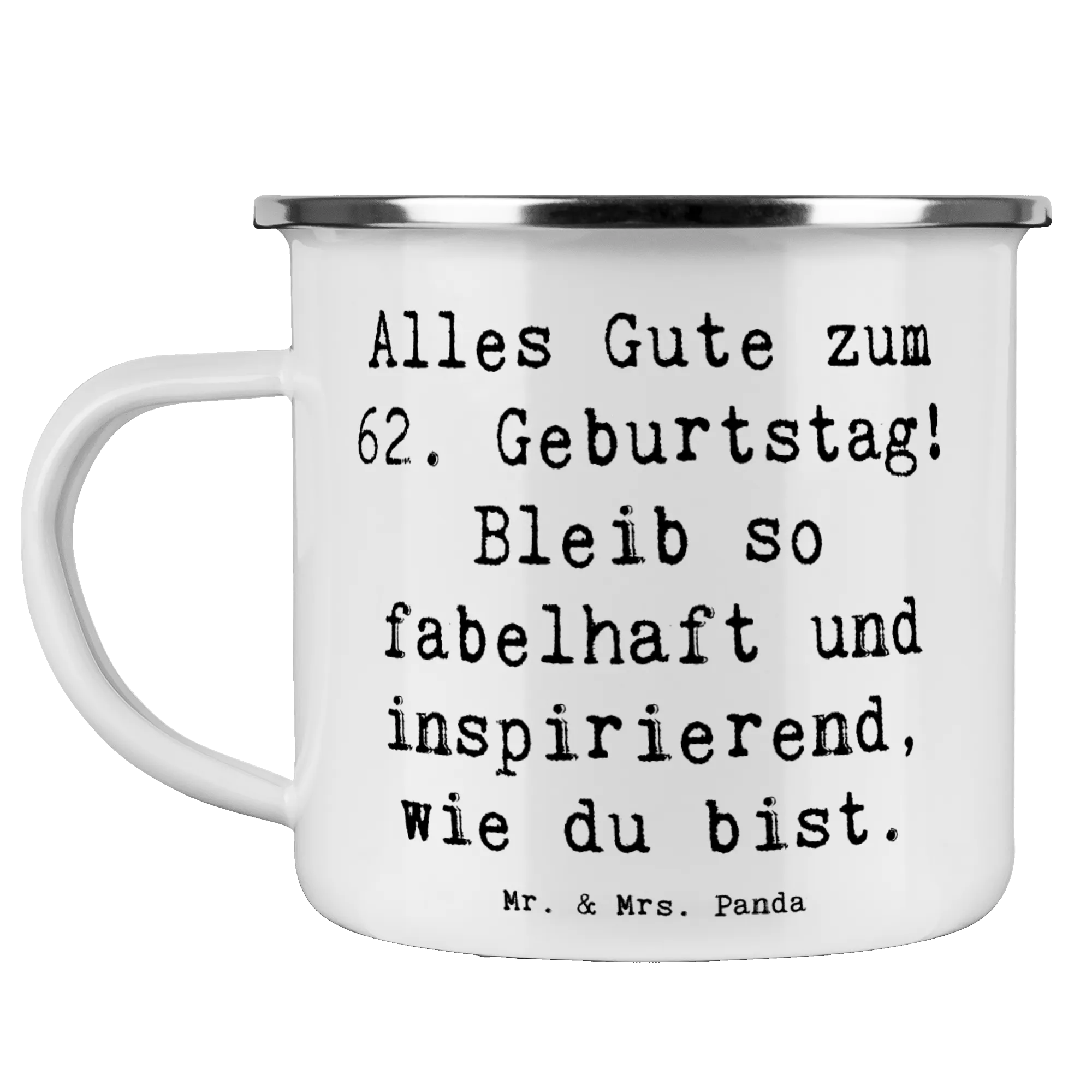 Die Camping Emaille Tasse zum 62. Geburtstag von Mr. & Mrs. Panda ist das perfekte Geschenk für alle, die ihren besonderen Tag gerne in der Natur feiern! Diese Tasse wird nicht nur mit dem liebevollen Spruch "Alles Gute zum 62. Geburtstag! Bleib so fabelhaft und inspirierend, wie du bist." bedruckt, sondern vereint auch eine funktionale Nutzung mit einem stilvollen Design.