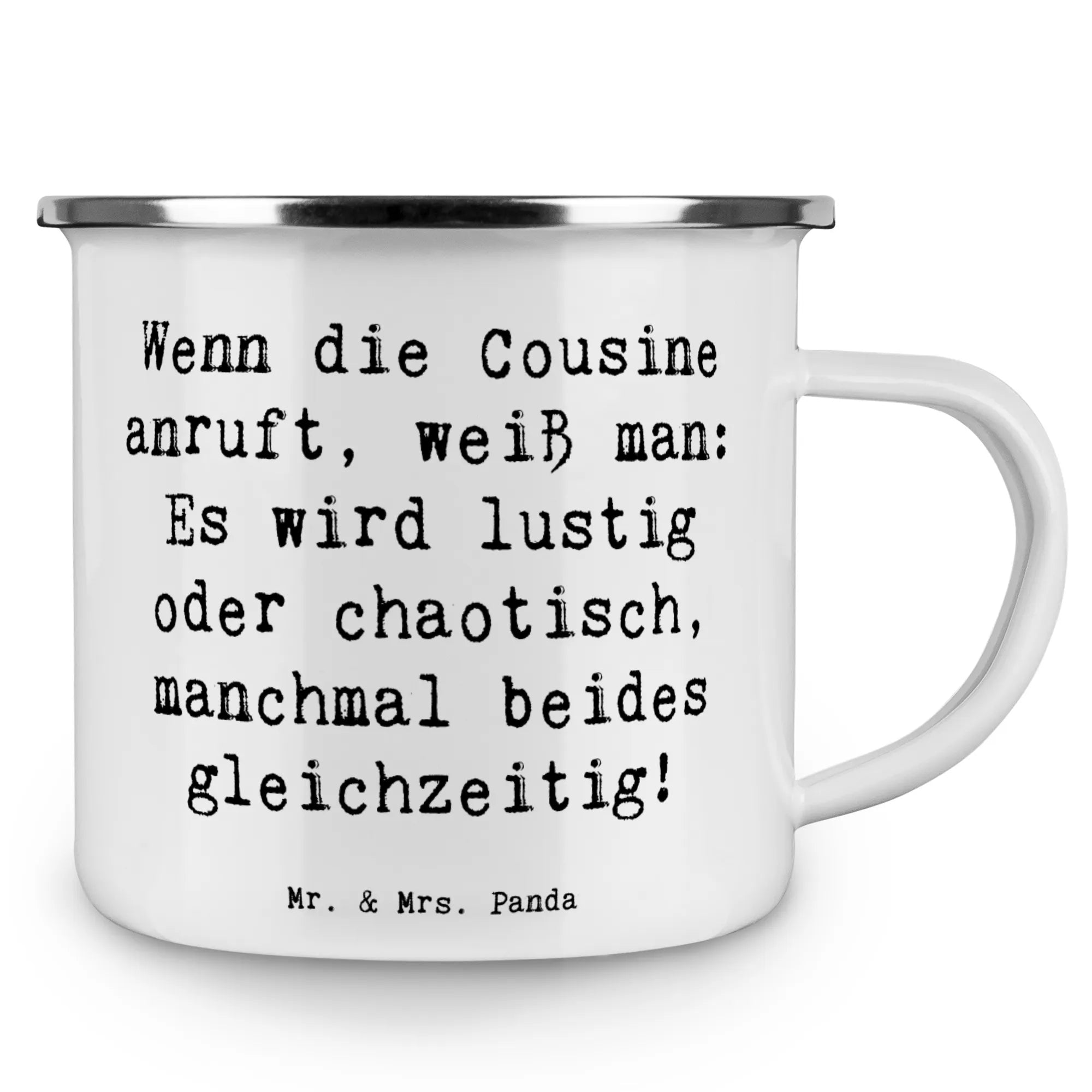 Die wunderschöne Camping Emaille Tasse von Mr. & Mrs. Panda ist der perfekte Begleiter für alle Abenteuer in der Natur und ein liebevolles Geschenk für Deine Cousine! Mit dem spritzigen Motto 'Wenn die Cousine anruft, weiß man: Es wird lustig oder chaotisch, manchmal beides gleichzeitig!' zaubert sie jedem ein Lächeln ins Gesicht.