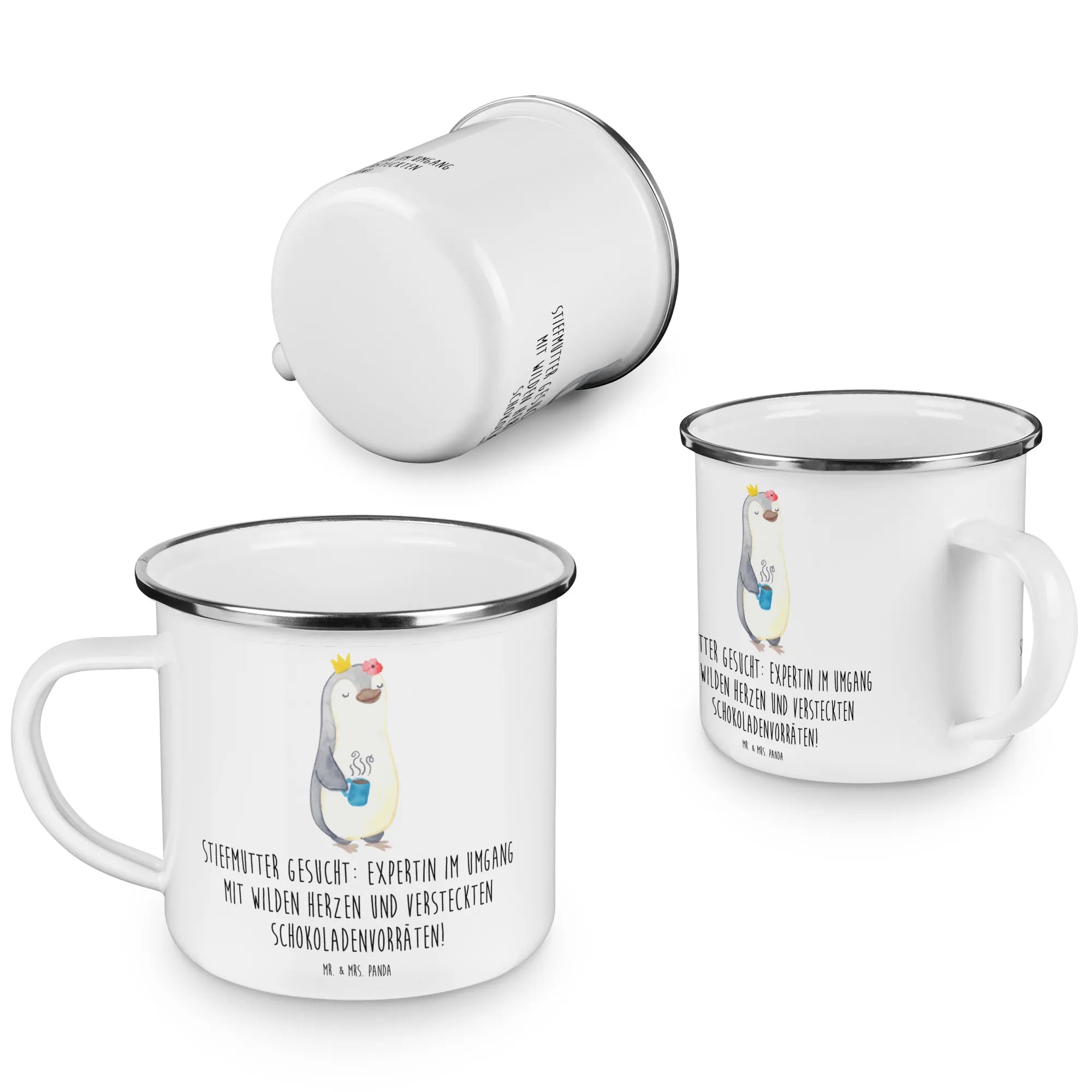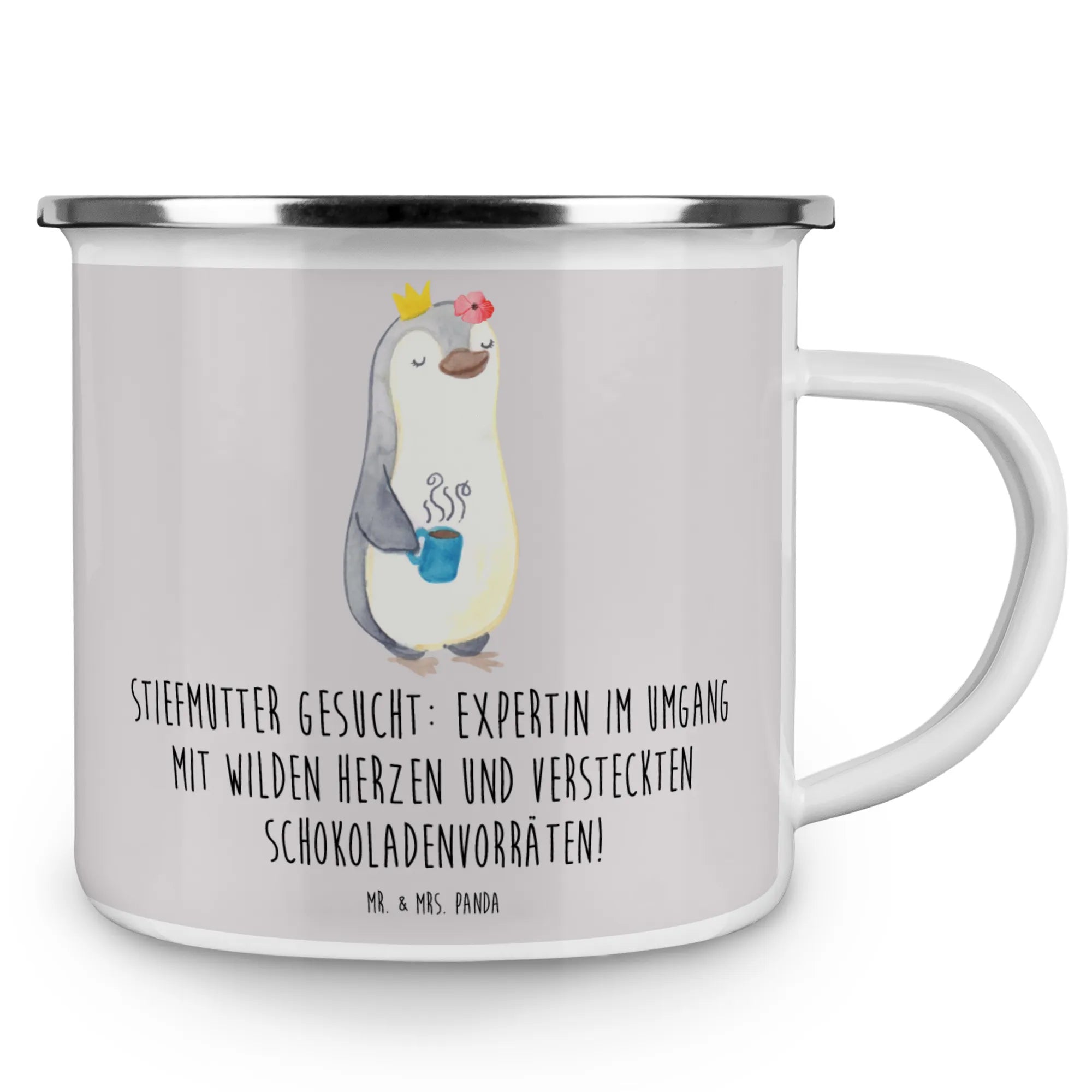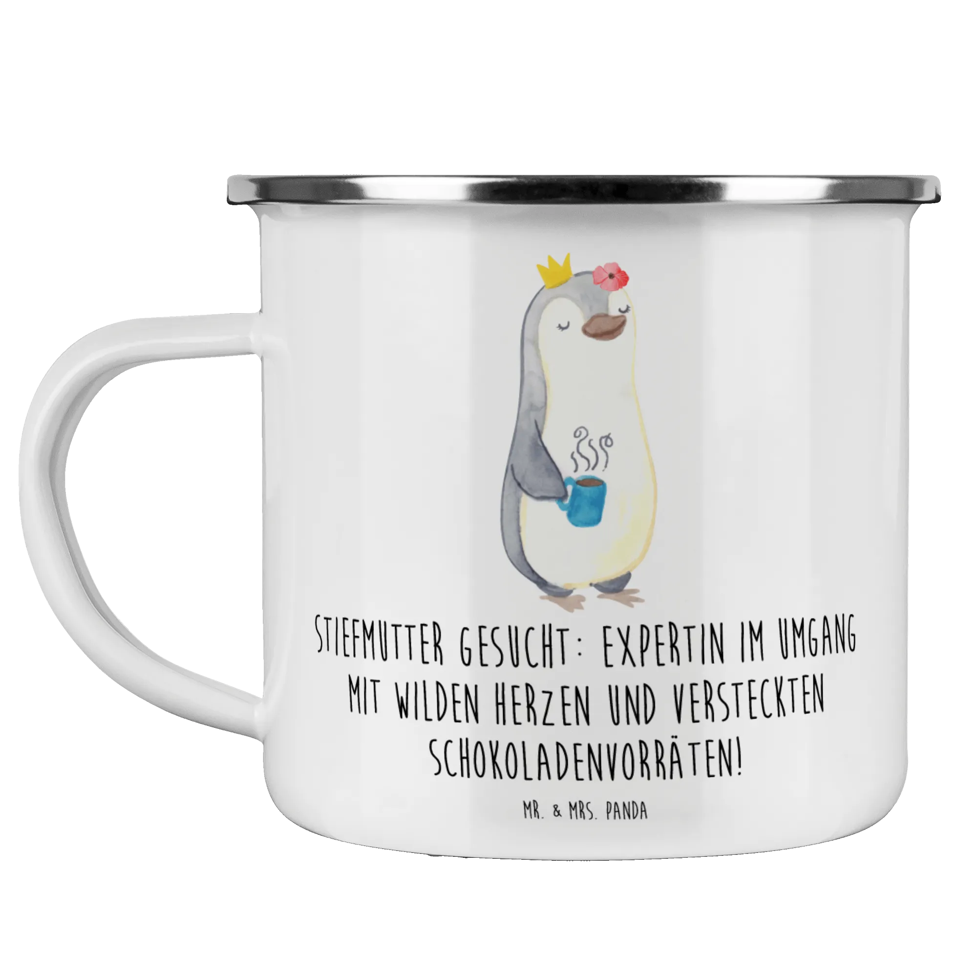 Die wunderschöne Camping Emaille Tasse "Stiefmutter gesucht: Expertin im Umgang mit wilden Herzen und versteckten Schokoladenvorräten!" von Mr. & Mrs. Panda ist das perfekte Geschenk für alle Stiefmütter da draußen! Egal ob für den nächsten Campingausflug oder entspannte Tage im Garten, diese Tasse ist der ideale Begleiter.
