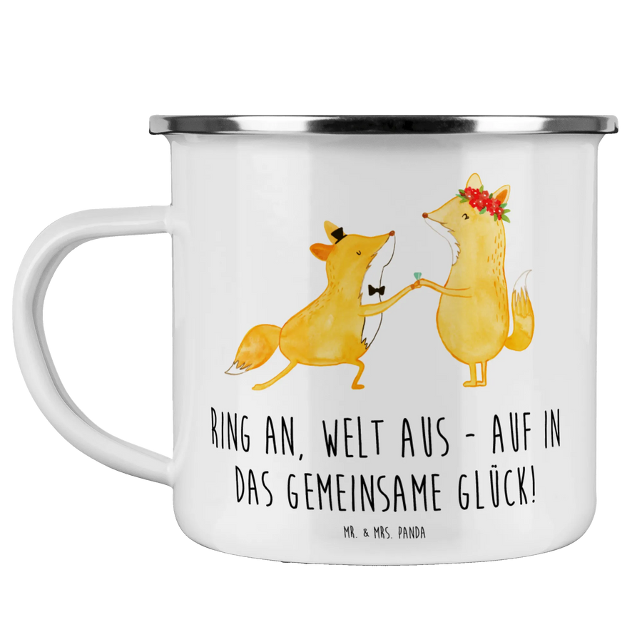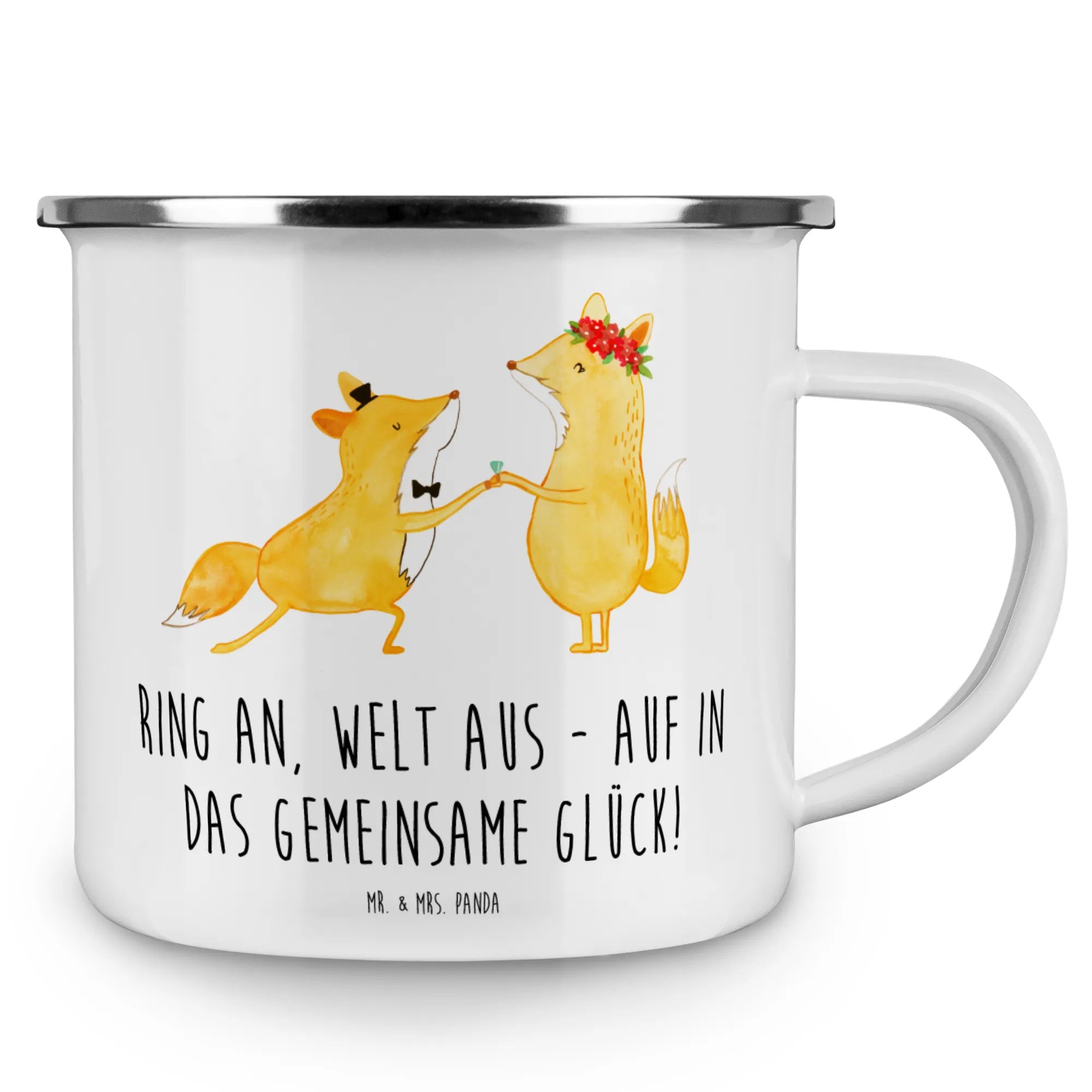 Die Pflege ist einfach – sanfte Handwäsche wird empfohlen, um die Tasse in ihren besten Zustand zu halten. Die Camping Emaille Tasse ist Teil der zauberhaften Hochzeitskollektion von Mr. & Mrs. Panda, die für jeden Moment rund um den schönsten Tag deines Lebens das perfekte Accessoire bietet. Nutze diese Möglichkeit, um eine besondere Erinnerung an den Beginn eines gemeinsamen Lebens zu schaffen.
