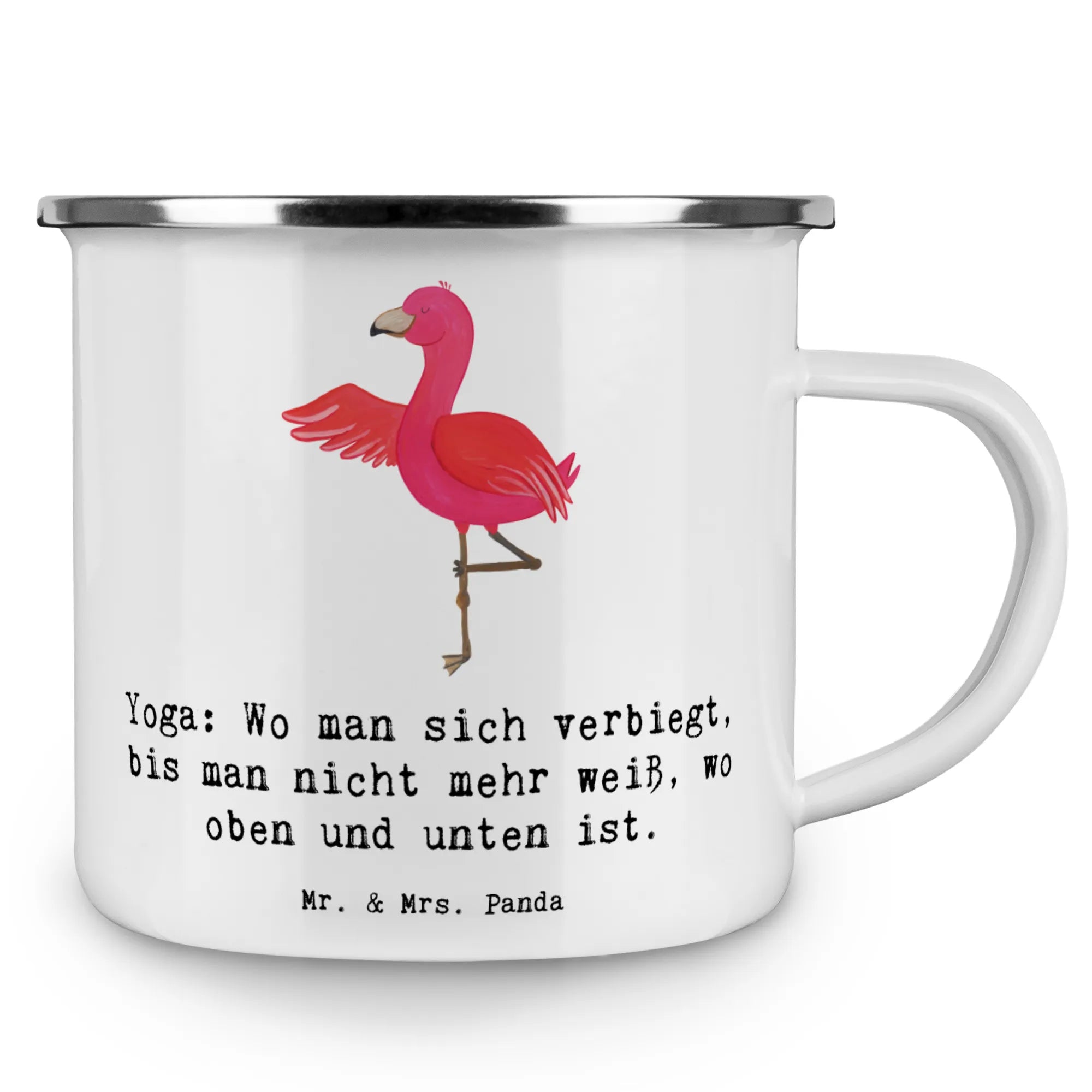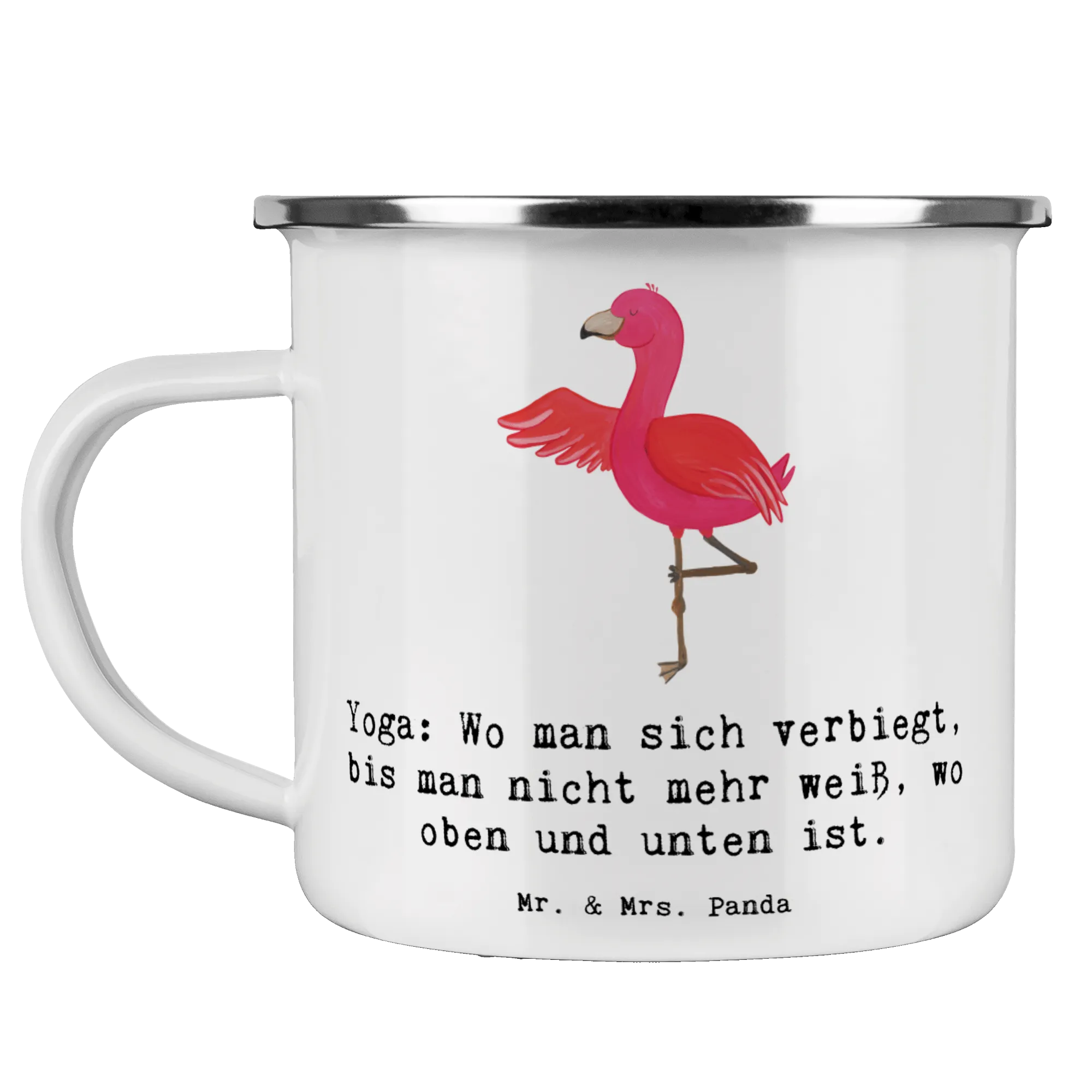 Die Camping Emaille Tasse Yoga von Mr. & Mrs. Panda ist das ideale Geschenk für alle Sport- und Yoga-Liebhaber! Mit ihrem charmanten Design und dem Spruch "Yoga: Wo man sich verbiegt, bis man nicht mehr weiß, wo oben und unten ist." bringt sie jeden zum Schmunzeln und sorgt für gute Laune.