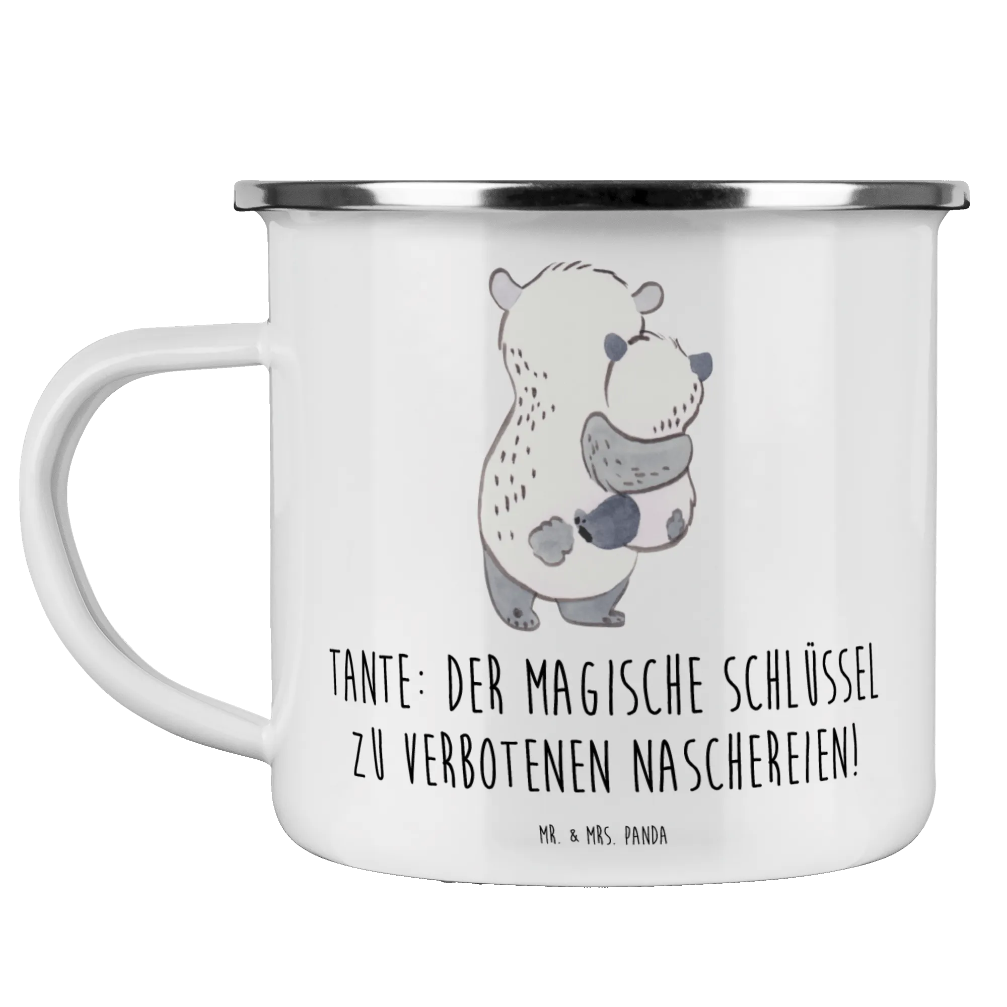 Die Camping Emaille Tasse "Tante: Der magische Schlüssel zu verbotenen Naschereien!" von Mr. & Mrs. Panda ist das perfekte Geschenk für jede Tante und verleiht jeder Outdoor-Aktivität das gewisse Etwas. Tassen wie diese bringen nicht nur Freude in die Küche oder zum nächsten Campingabenteuer, sondern feiern auch die besondere Beziehung zwischen Tanten, ihren Nichten und Neffen.