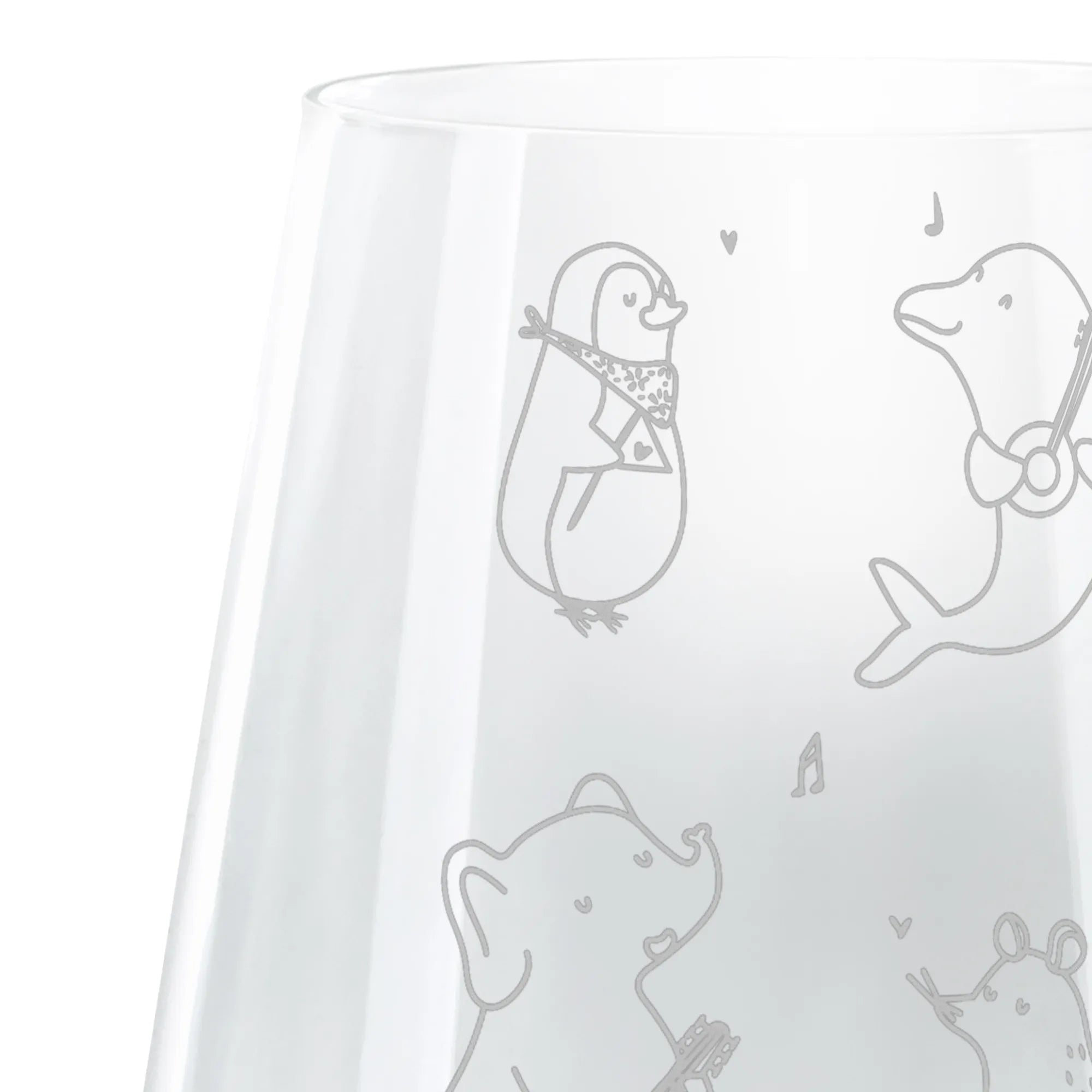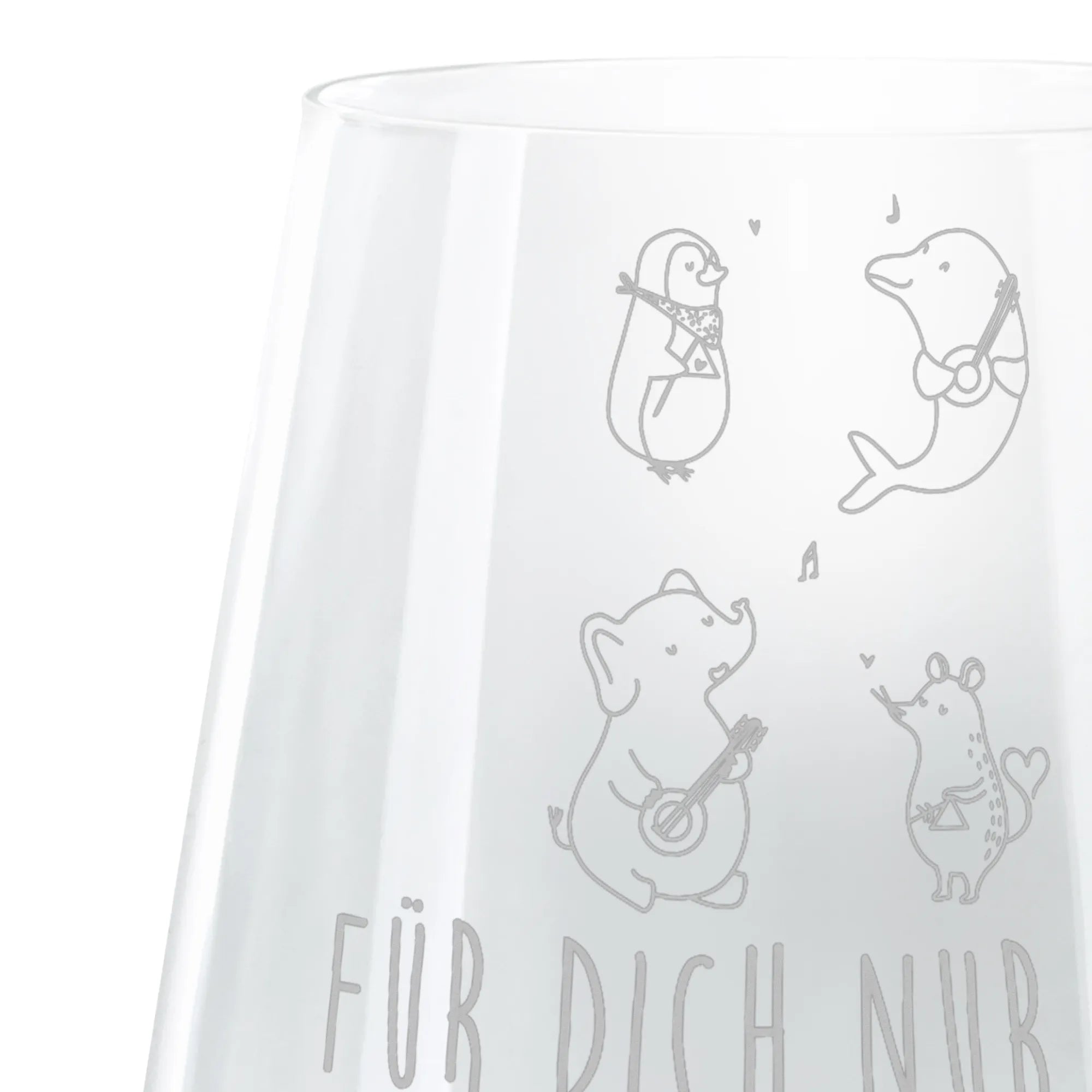 Die sorgfältige Lasergravur sorgt nicht nur für einen matteffekt, sondern auch für langlebige Freude an diesem eleganten Glas. Das Design zeigt eine witzige Truppe aus einem Pinguin, einer Maus, einem Delfin und einem Elefanten, die in ihren bunten Kostümen die besten Melodien spielen. Mit dem Slogan "Für dich nur das Beste zum Feste" wird dieses Glas zur optimalen Wahl für Feierlichkeiten und besondere Anlässe.