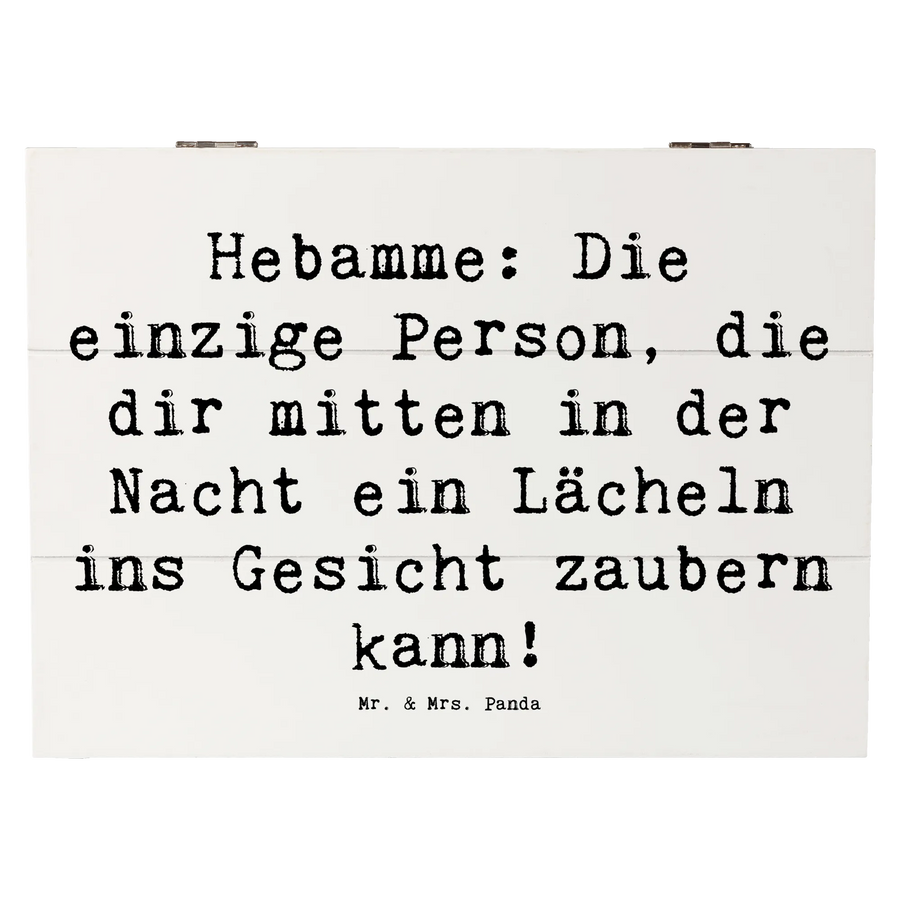 Entdecke die wunderschöne Holzkiste von Mr. & Mrs. Panda mit dem liebevollen Motiv "Hebamme: Die einzige Person, die dir mitten in der Nacht ein Lächeln ins Gesicht zaubern kann!" Diese Erinnerungskiste ist nicht nur ein schöner Aufbewahrungsort für all Deine kostbaren Schätze, sondern auch ein ideales Geschenk für alle, die mit Herz und Leidenschaft als Hebamme tätig sind. Ob zur Geburt, als Dankeschön oder einfach nur, um jemandem eine Freude zu bereiten, diese Kiste ist das perfekte Geschenk zu jedem Anlass.