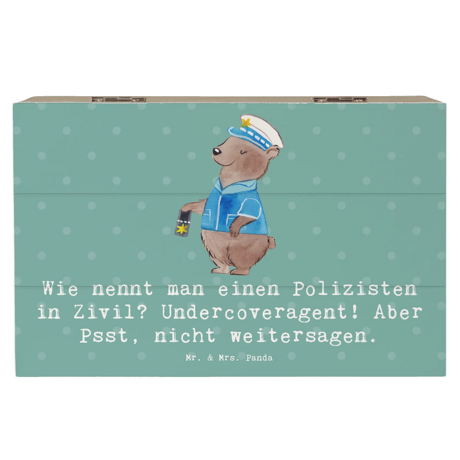 Die wunderschöne Holzkiste mit dem Polizisten-Motiv von Mr. & Mrs. Panda ist das perfekte Geschenk für alle, die den Beruf des Polizisten schätzen oder selbst in diesem Bereich tätig sind. Diese erstklassige Erinnerungsbox bietet nicht nur eine kuschelige Heimat für all deine wertvollen Schätze, sondern bringt auch ein Lächeln auf dein Gesicht mit dem charmanten Spruch: 'Wie nennt man einen Polizisten in Zivil? Undercoveragent! Aber Psst, nicht weitersagen.' Diese Kiste ist nicht einfach nur eine dekorative Aufbewahrungsbox; sie ist ein Ort, an dem Erinnerungen aufbewahrt und Feiern zelebriert werden.