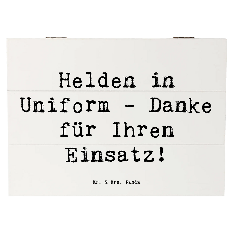Entdecke die wunderschöne Holzkiste von Mr. & Mrs. Panda, die besonders für alle Helden in Uniform gedacht ist! Mit dem liebevollen Spruch "Helden in Uniform - Danke für Ihren Einsatz!" auf der Oberfläche ist diese Kiste nicht nur ein ganz besonderer Blickfang, sondern auch eine wunderbare Möglichkeit, Dankbarkeit zu zeigen. Perfekt geeignet als Geschenk für Polizisten, Feuerwehrleute oder andere Berufsretter, ist diese Kiste ideal für zahlreiche Anlässe: Ob zur Verabschiedung, zum Geburtstag oder einfach als kleine Aufmerksamkeit zwischendurch, sie kommt immer gut an!