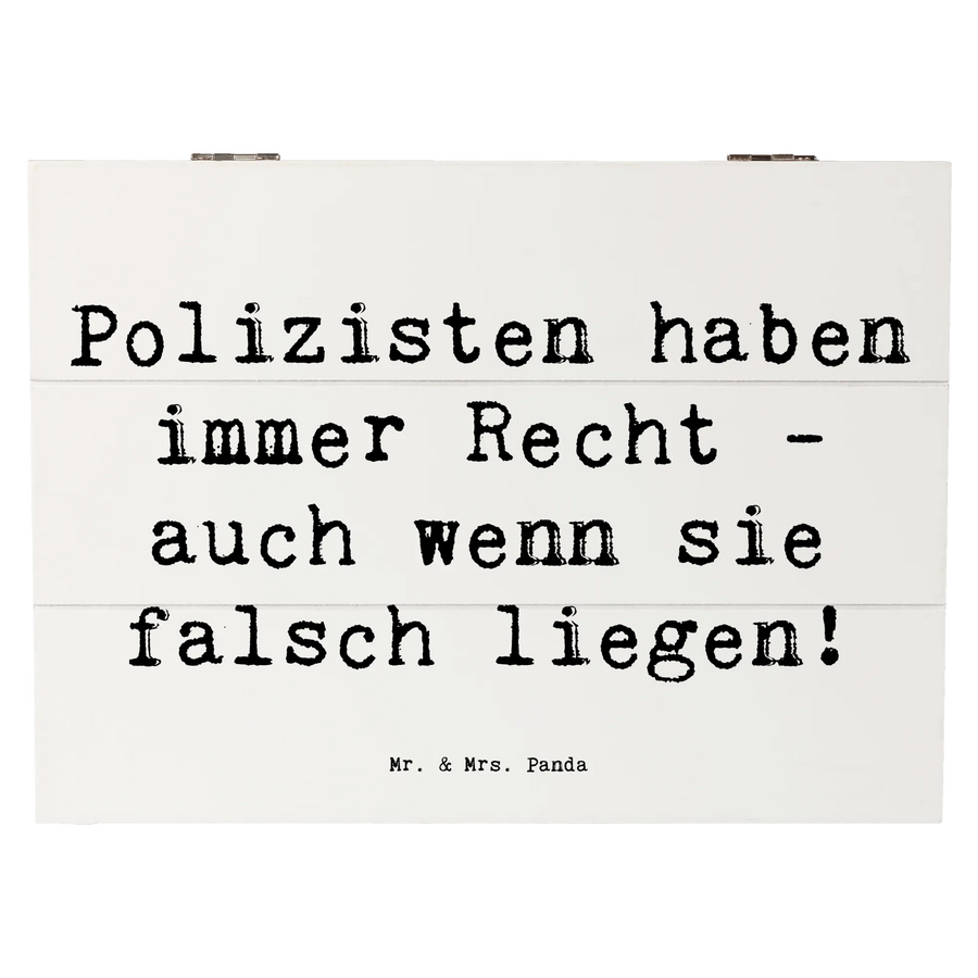 Die Holzkiste im Polizisten-Design von Mr. & Mrs. Panda ist das perfekte Geschenk für alle, die mit Leidenschaft ihrem Beruf nachgehen und es lieben, diesen auch zuhause zu zelebrieren. Egal ob als Erinnerungskiste, Schatzkiste oder einfach nur als stilvolle Aufbewahrungsbox – diese wunderschöne Kiste aus hochwertiger, robuster Holzfaser sorgt nicht nur für Ordnung, sondern bringt auch eine Portion Humor ins Spiel. Mit dem witzigen Spruch "Polizisten haben immer Recht - auch wenn sie falsch liegen!" zaubert sie jedem ein Schmunzeln ins Gesicht.