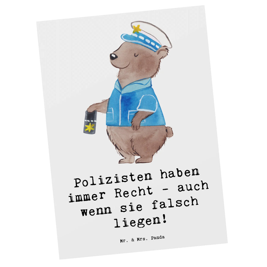 Unsere Postkarte „Polizist“ aus der Mr. & Mrs. Panda Berufe-Kollektion bringt mit dem frechen Spruch „Polizisten haben immer Recht - auch wenn sie falsch liegen!“ ein Lächeln auf jedes Gesicht. Die liebevoll von Mrs. Panda gezeichnete Illustration kombiniert Niedlichkeit mit einem Augenzwinkern – ideal als Geschenk oder kleine Aufmerksamkeit. 🎁