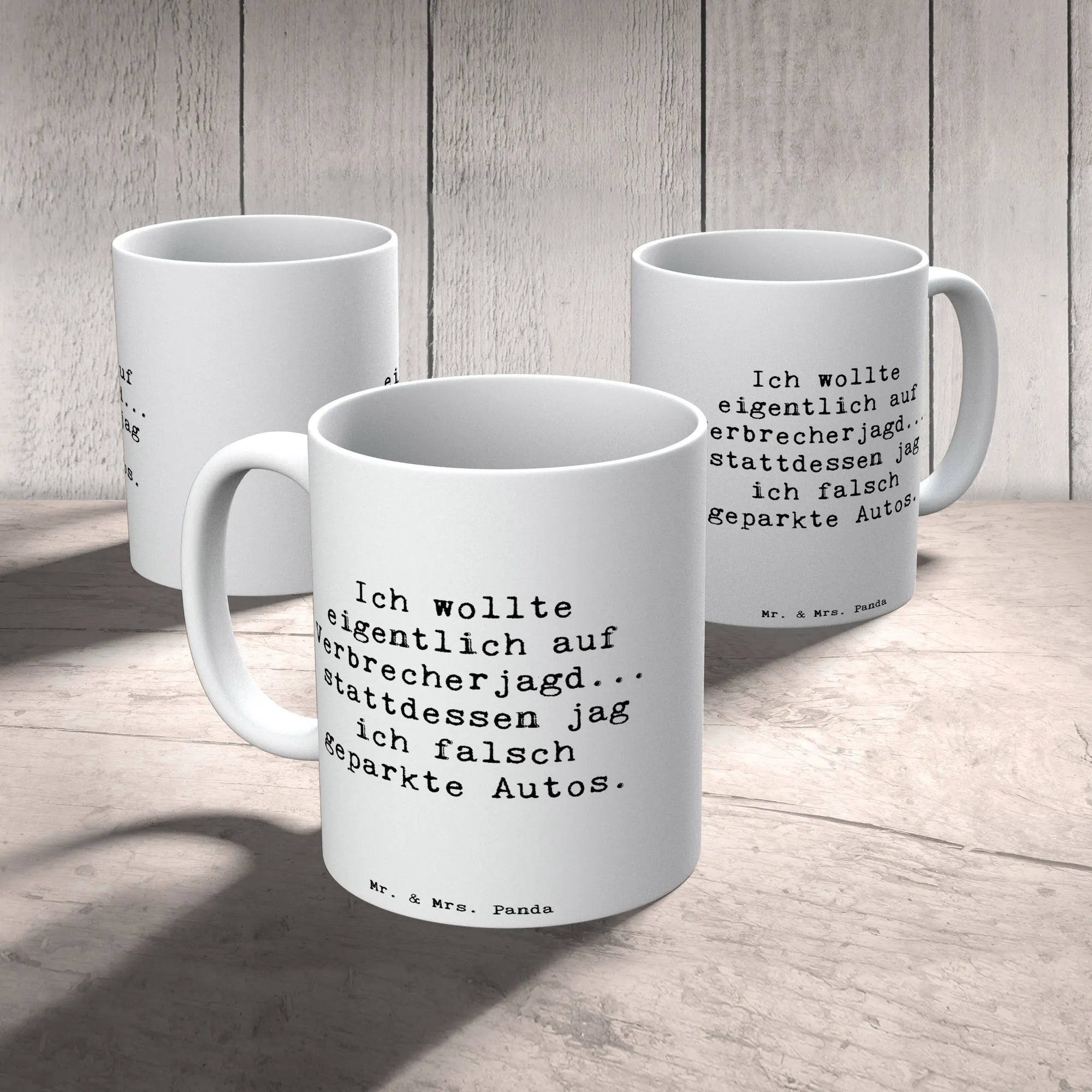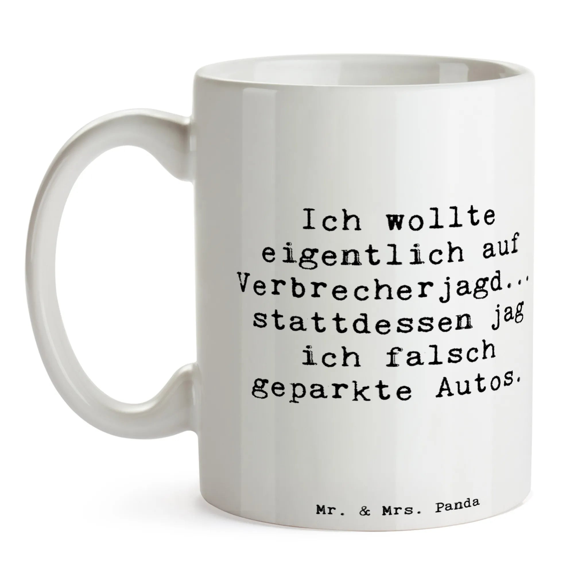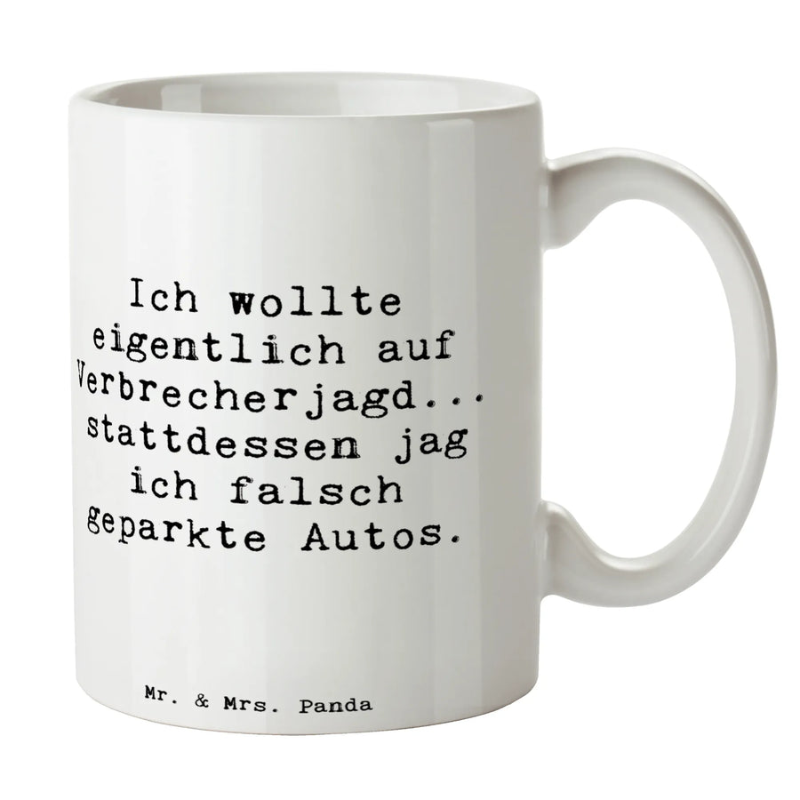 Die Tasse „Polizist“ aus der Berufe-Kollektion von Mr. & Mrs. Panda ist eine herrlich witzige Kaffeetasse mit dem Spruch „Ich wollte eigentlich auf Verbrecherjagd... stattdessen jag ich falsch geparkte Autos.“ Diese Motivtasse bringt Humor in die Kaffeepause, zaubert ein Lächeln in die Büroküche und ist ein echter Hingucker auf jedem Schreibtisch.