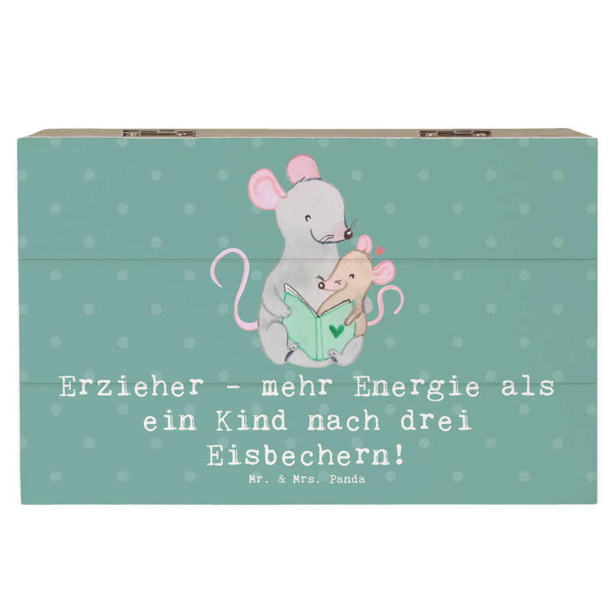 Die wunderschöne Holzkiste mit dem liebevollen Motiv "Erzieher - mehr Energie als ein Kind nach drei Eisbechern!" von Mr. & Mrs. Panda ist das perfekte Geschenk für alle, die mit Leidenschaft in der Bildungswelt tätig sind.