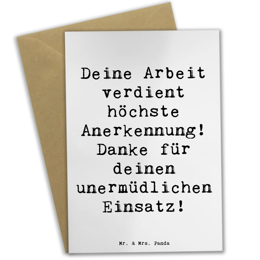 Ob zu besonderen Anlässen wie Geburtstagen, Hochzeiten oder einfach nur so: Diese Karte wird ein Lächeln ins Gesicht zaubern! Mit dem Spruch "Deine Arbeit verdient höchste Anerkennung! Danke für deinen unermüdlichen Einsatz!" auf der Vorderseite, wird jeder, der diese Karte erhält, gleich gespürt, wie sehr ihre Arbeit gewürdigt wird.
