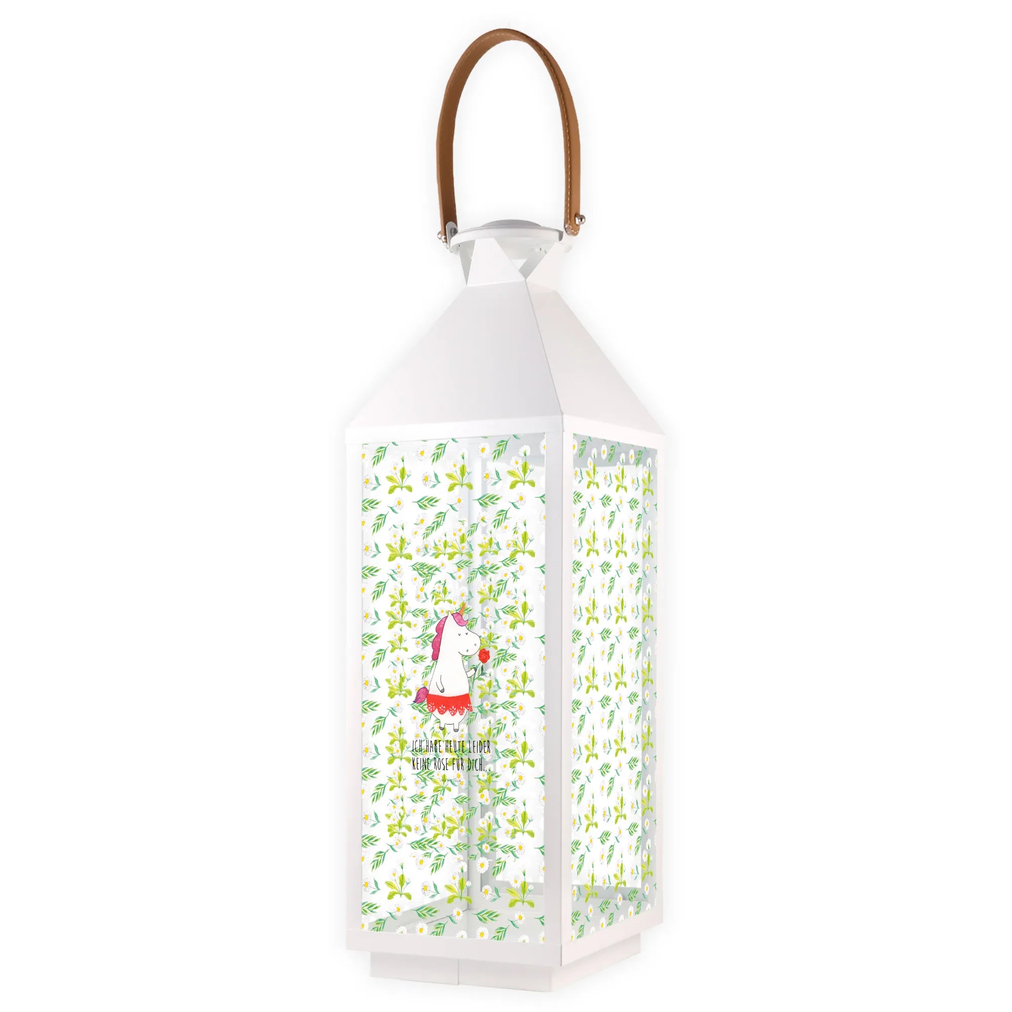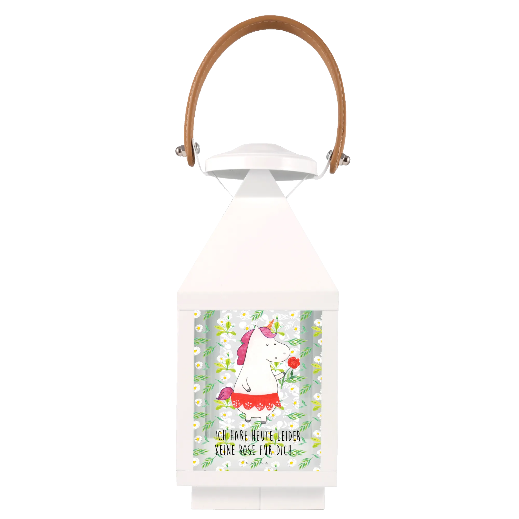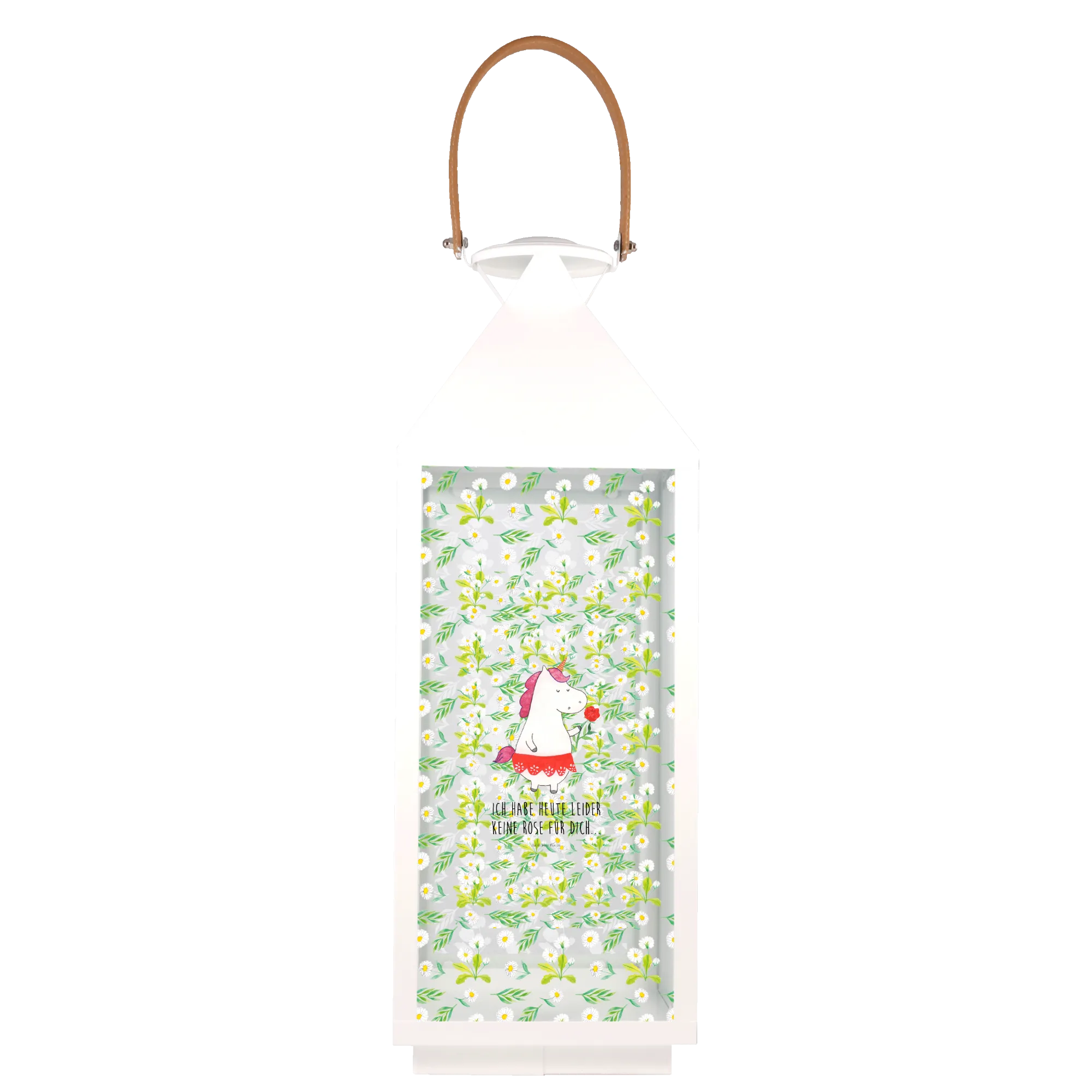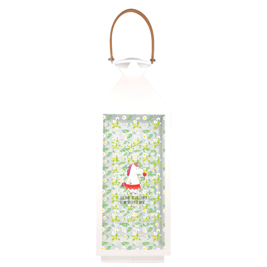 Die Laterne ist aus hochwertigem, weiß lackierten Premium Metall gefertigt und bietet dir nicht nur eine tolle Optik, sondern auch eine hohe Langlebigkeit. Verziert mit einem handgezeichneten Einhorn-Motiv und dem charmanten Spruch "Ich habe heute leider keine Rose für dich", sorgt sie für gute Laune und lässt dein Herz höher schlagen.