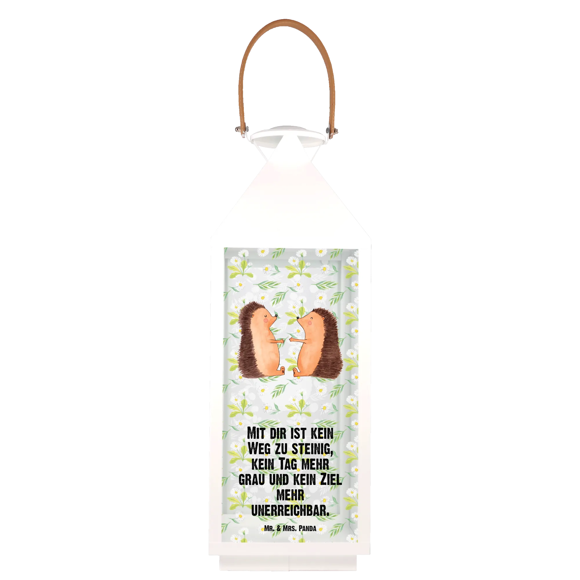Mit den niedlichen, verliebten Igeln, die sich innig gegenüberstehen und mit liebevollen Details entworfen wurden, wird jeder Moment zu etwas ganz Besonderem. Die Herzen verschmelzen, wenn Du diese Laterne als Geschenk überreichst. Der Slogan "Mit dir ist kein Weg zu steinig, kein Tag mehr grau und kein Ziel mehr unerreichbar" sorgt für zusätzliche emotionale Tiefe und lässt die Laterne zu einem außergewöhnlichen Liebesgeschenk werden.