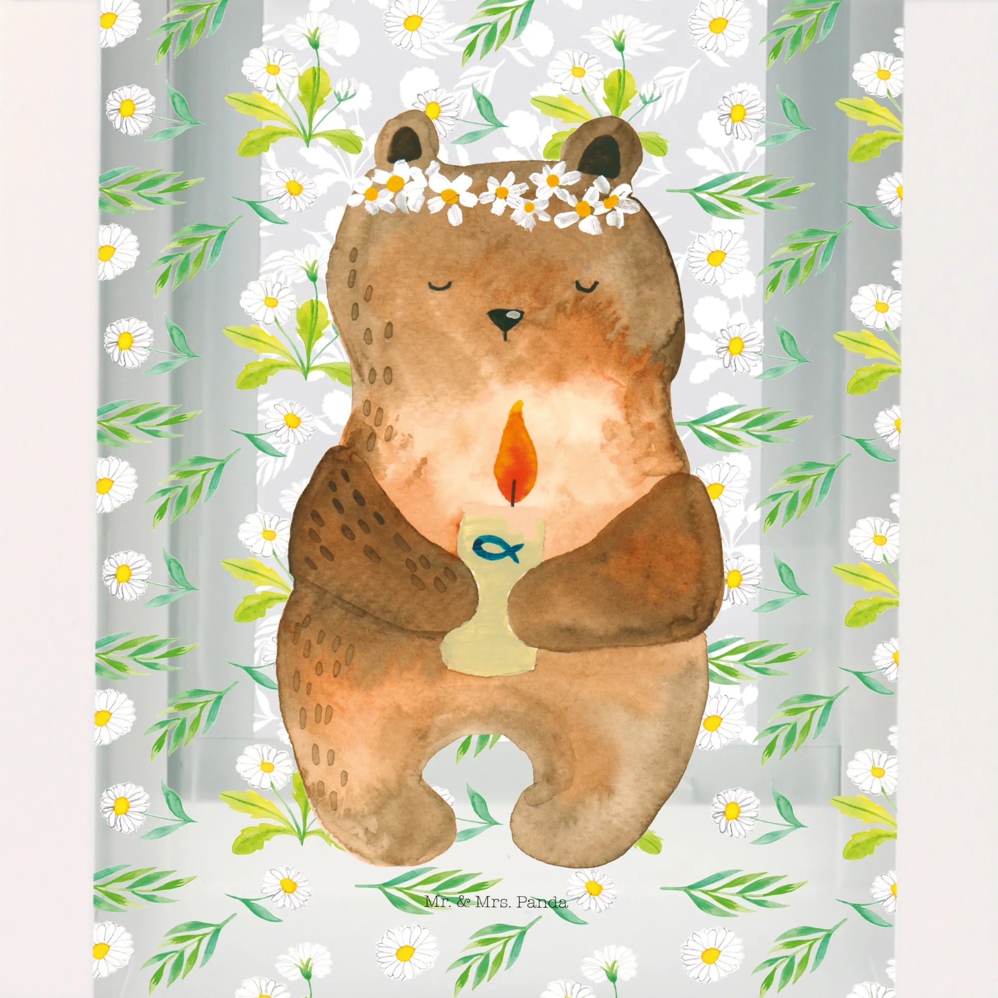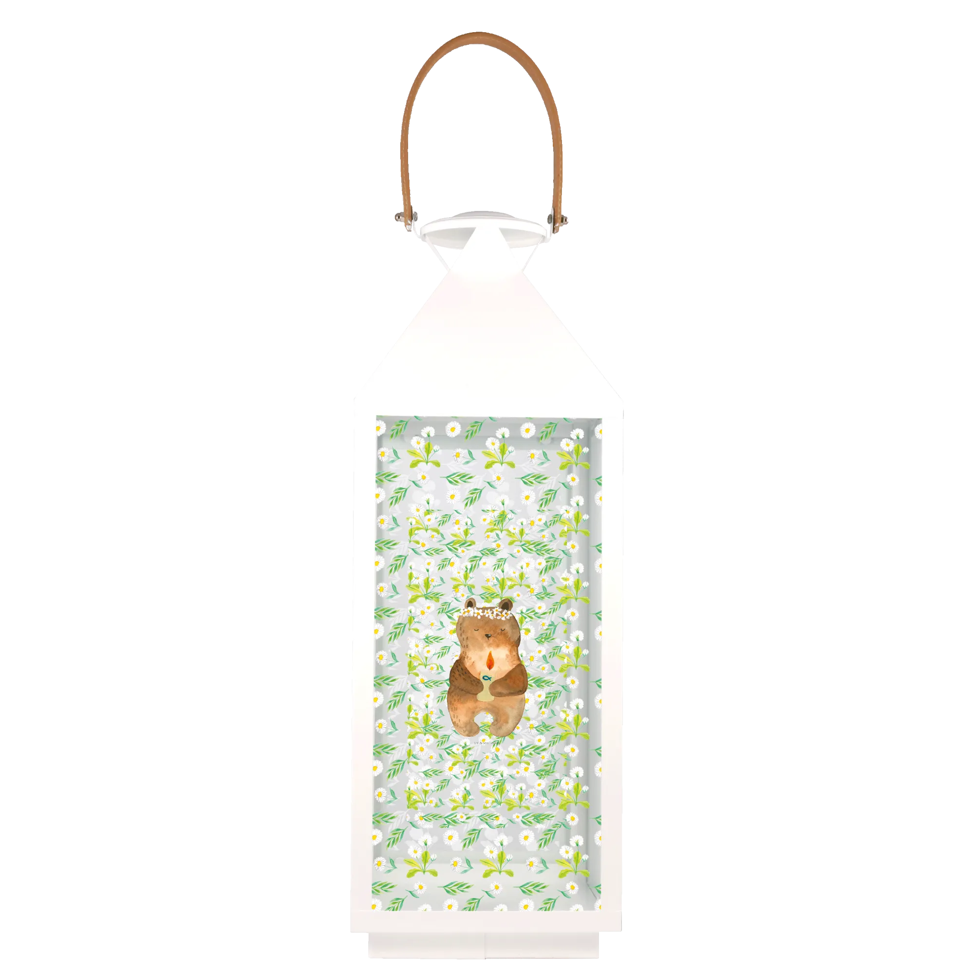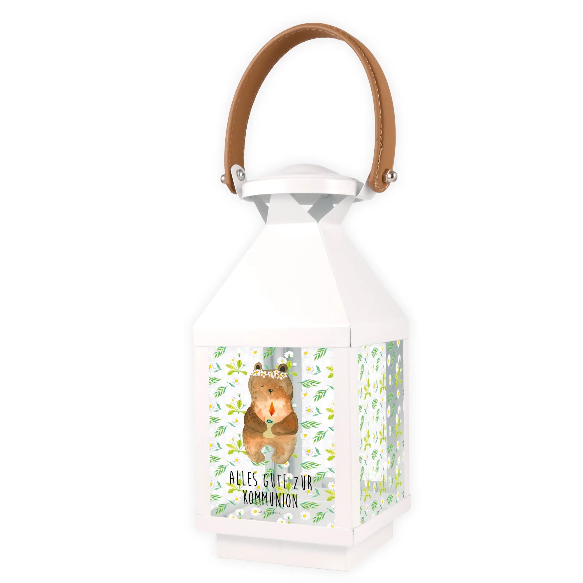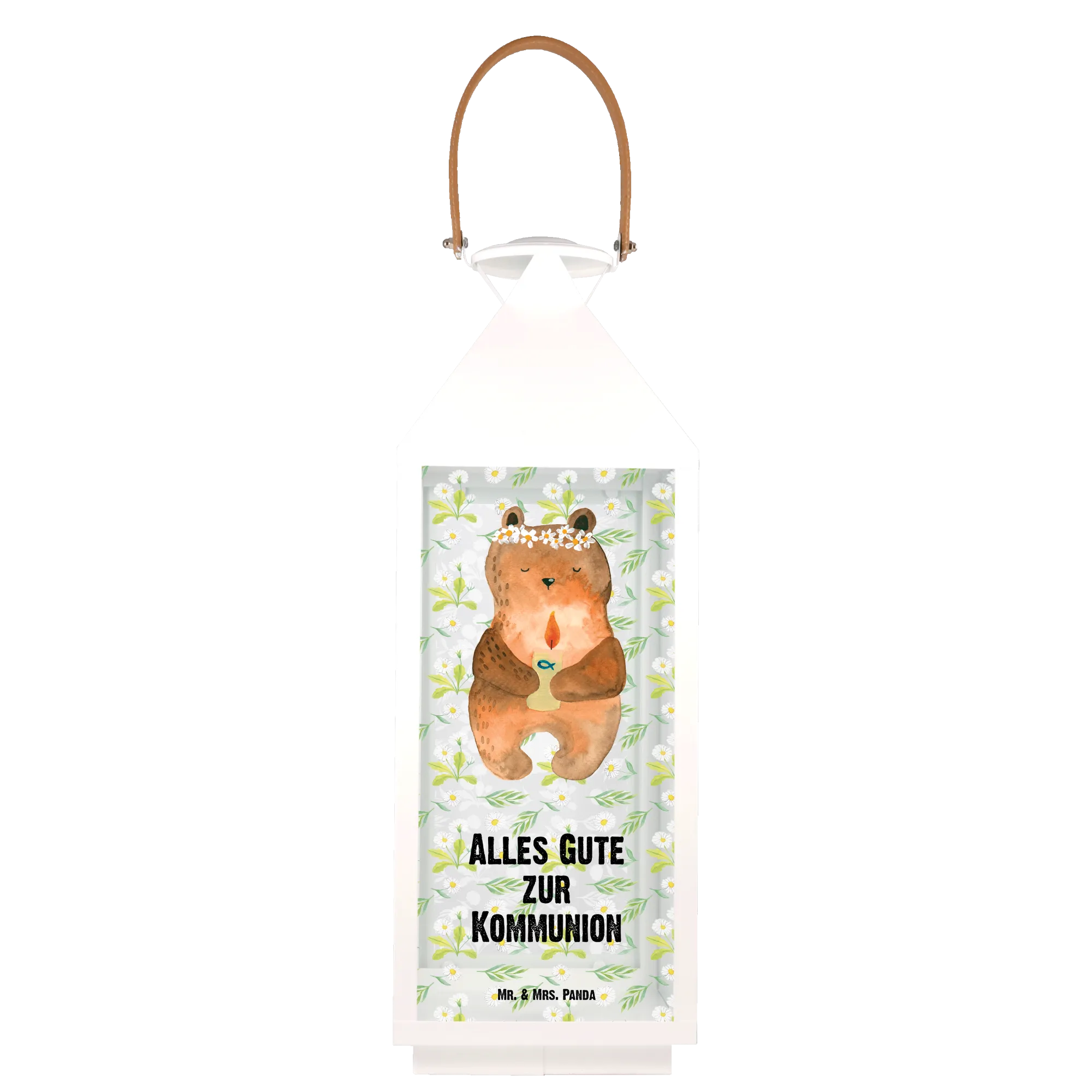 Ein weiteres Highlight der Deko Laterne ist die liebevolle Handzeichnung von Mrs. Panda. Jedes Detail – von der süßen Bärenillustration bis hin zu den floralen Elementen – wird mit besonderer Hingabe und Liebe präsentiert. So wird diese Laterne zu einem einzigartigen Geschenk, das die Erinnerung an die Kommunion immer lebendig hält.