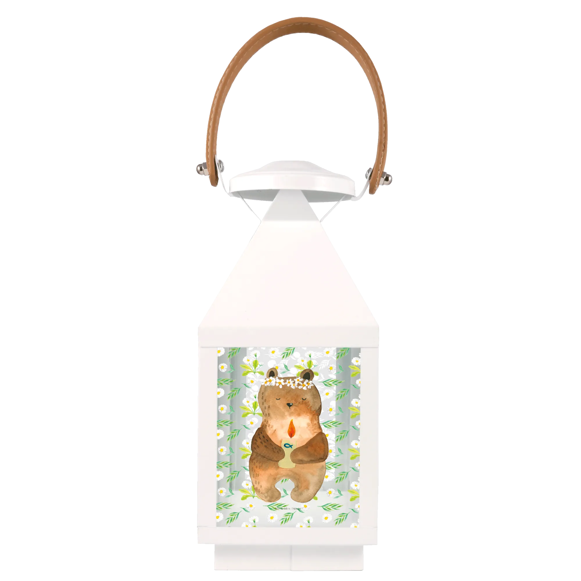 Der süße Bär mit der Blumenkrone und der Kerze in der Hand, die Licht spendet, wird sowohl die Herzen der Kinder als auch der Erwachsenen erobern. Die Laterne ist aus hochwertigem, langlebigen Metall gefertigt, und die feinen Glaselemente sind mit den niedlichen Motiven von Mr. & Mrs. Panda bedruckt.