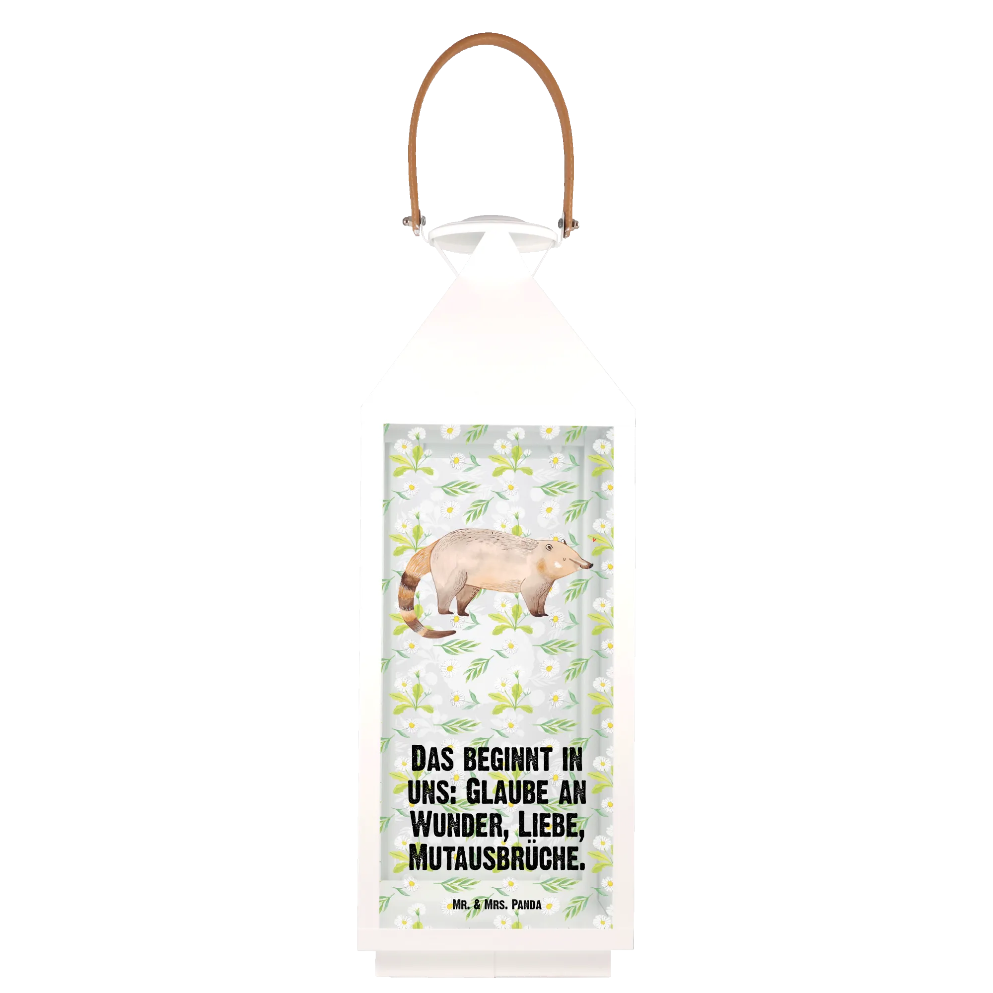 Der niedliche Nasenbär auf der Laterne strahlt mit seinen großen Augen und seiner putzigen Schnauze, sodass er jedem Betrachter ein Lächeln ins Gesicht zaubert. Das Motiv wurde mit viel Liebe zum Detail von Mrs. Panda handgezeichnet und kombiniert mit dem inspirierenden Spruch: "Das beginnt in uns: Glaube an Wunder, Liebe, Mutausbrüche." Diese Botschaft bringt noch mehr Freude in jeden Garten und in jedes Zuhause.