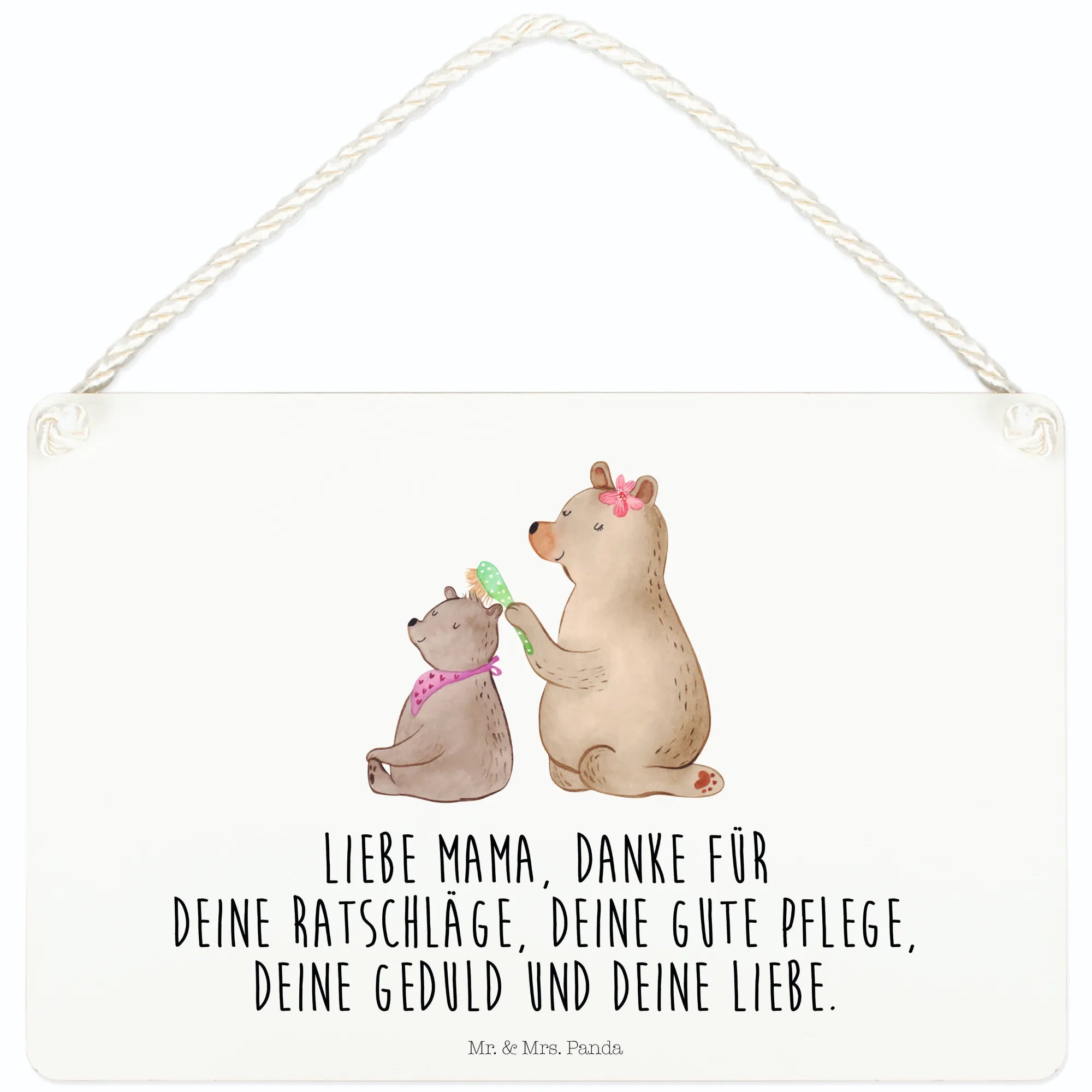 Ein liebevolles Deko Schild von Mr. & Mrs. Panda – das Motiv "Bär mit Kind" aus unserer Familien-Kollektion ist das perfekte Geschenk für Mama, Mutti oder die Großmutter. Das niedliche Motiv zeigt einen großen Bären mit blumengeschmückter Haarspange, der liebevoll das Fell eines kleineren Bären bürstet. Dazu der herzliche Spruch: "Liebe Mama, danke für deine Ratschläge, deine gute Pflege, deine Geduld und deine Liebe."