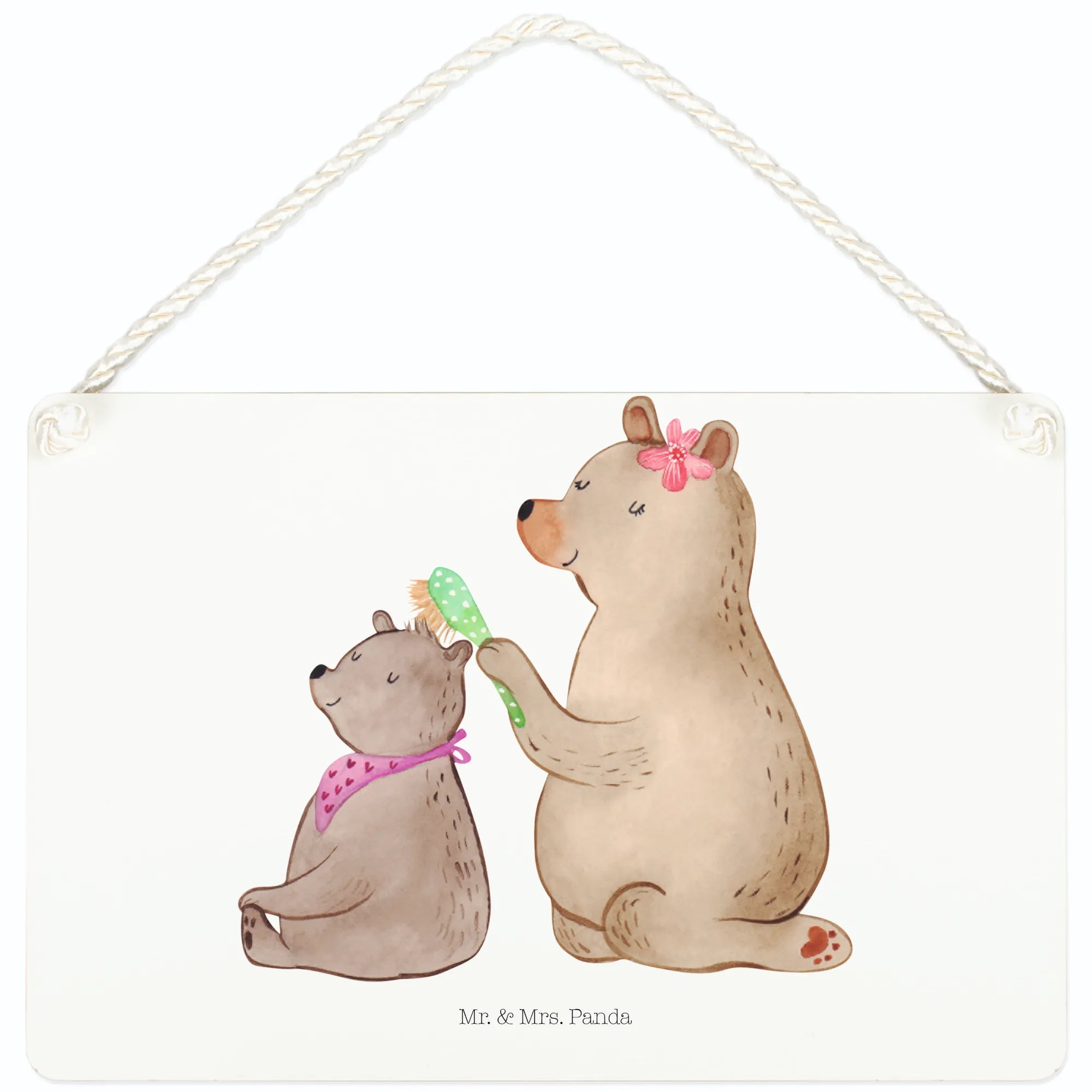 Das Motiv zeigt einen großen Bären, der liebevoll das Fell seines kleinen Bären bürstet, mit einer blumengeschmückten Haarspange im Haar. Diese Szene strahlt Wärme und Geborgenheit aus und symbolisiert die enge Bindung zwischen Mutter und Kind. Das Schild ist aus stabiler MDF-Platte gefertigt und weist eine beschichtete Oberfläche auf, die Langlebigkeit garantiert.