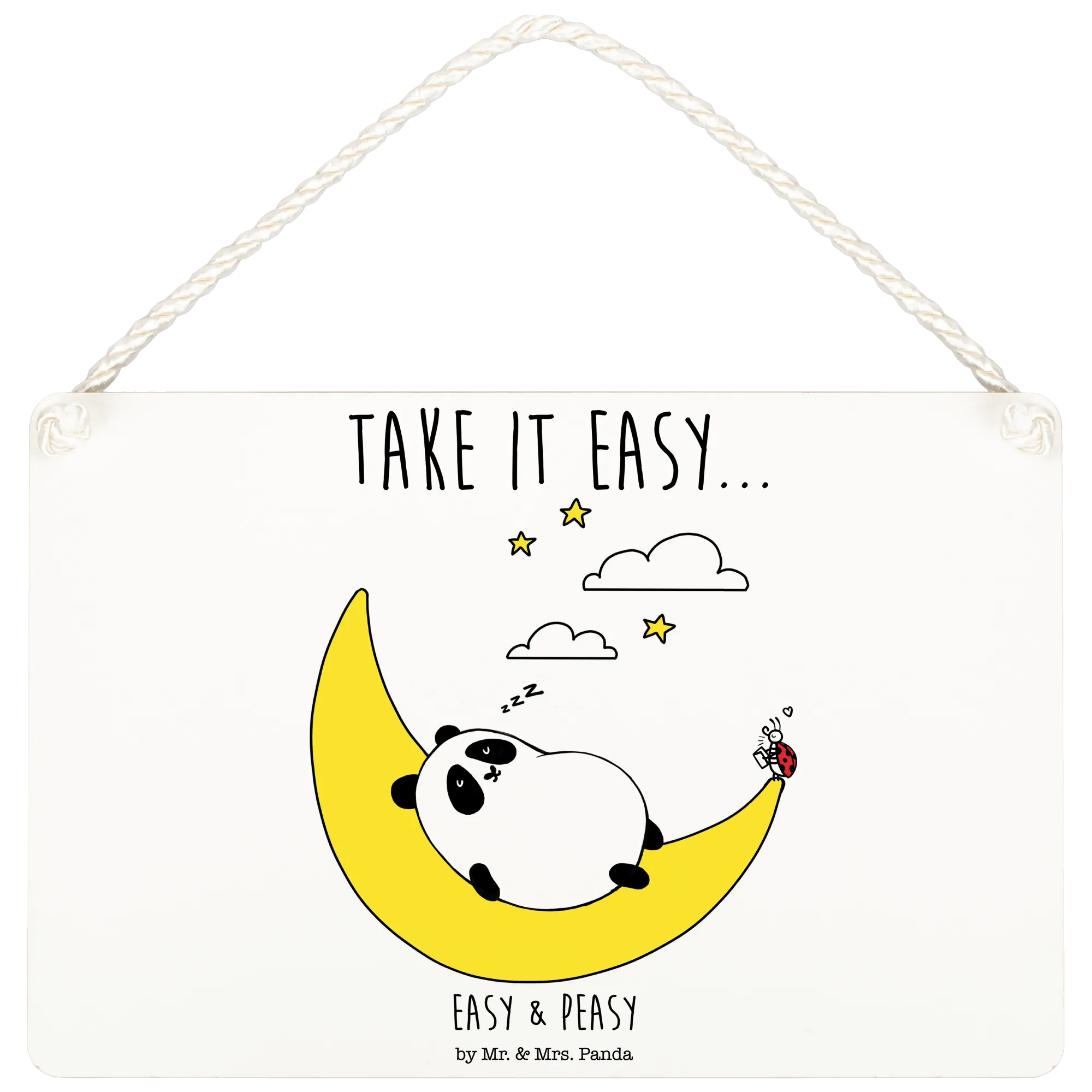 Das Deko Schild "Easy & Peasy Take it Easy" von Mr. & Mrs. Panda ist der perfekte Begleiter für all jene, die es lieben, eine entspannte und fröhliche Stimmung in ihrem Zuhause zu schaffen. Mit einem hübschen Design, das einen niedlichen Panda zeigt, der zufrieden auf einer Mondsichel schläft, sorgt dieses Schild für sofortige Freude und Gemütlichkeit.