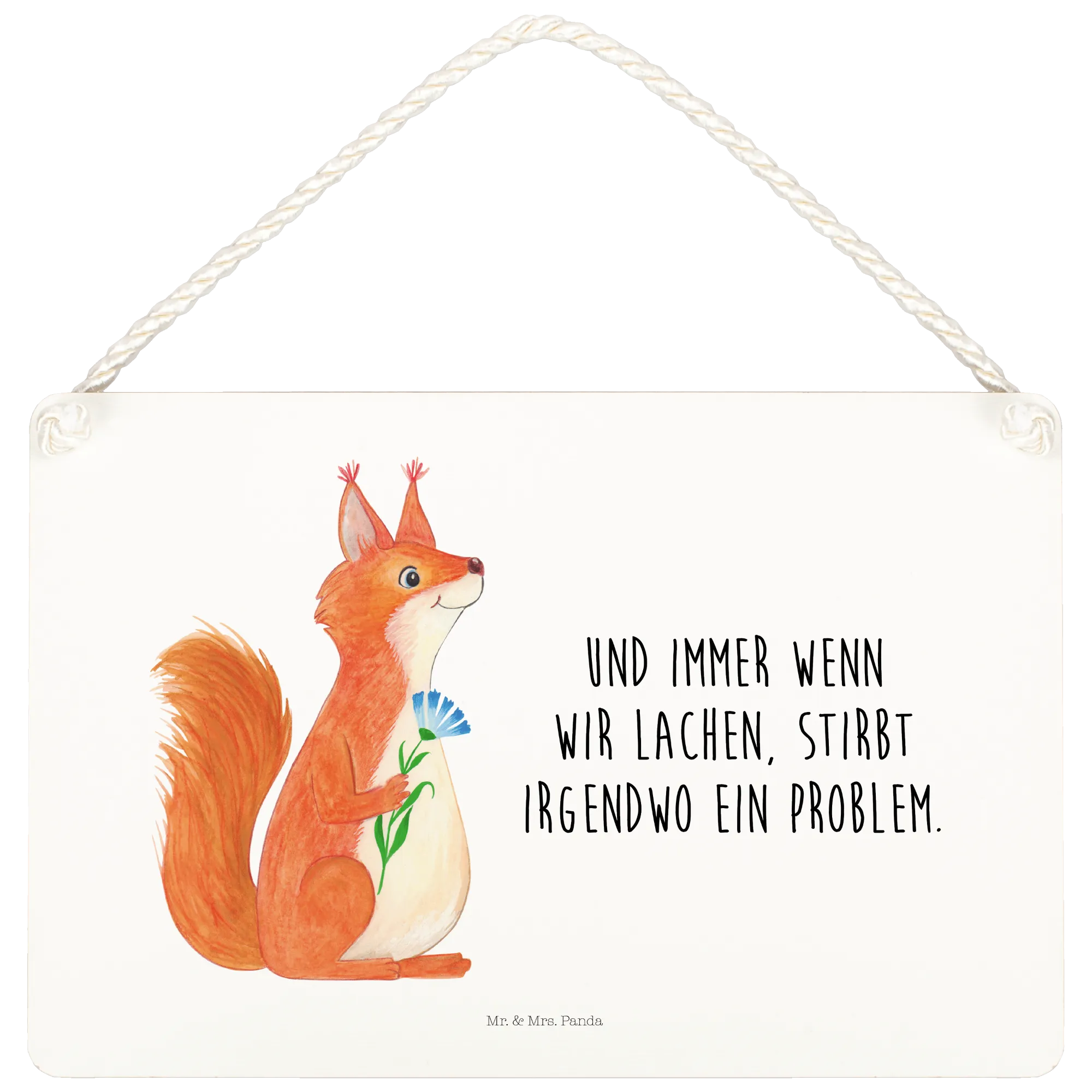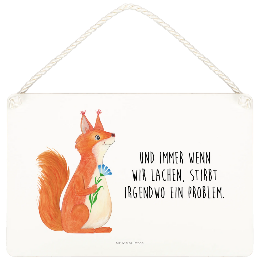 Ein wunderschönes und edles Deko Schild von Mr. & Mrs. Panda mit einem niedlichen Eichhörnchen, das begeistert eine Blume hält. Dieses Schild sorgt nicht nur für gute Laune in deinem Zuhause, sondern auch für ein Lächeln auf den Lippen jedes Besuchers. Mit dem inspirierenden Spruch 'Und immer wenn wir lachen, stirbt irgendwo ein Problem' bringt es positive Energie in jeden Raum.