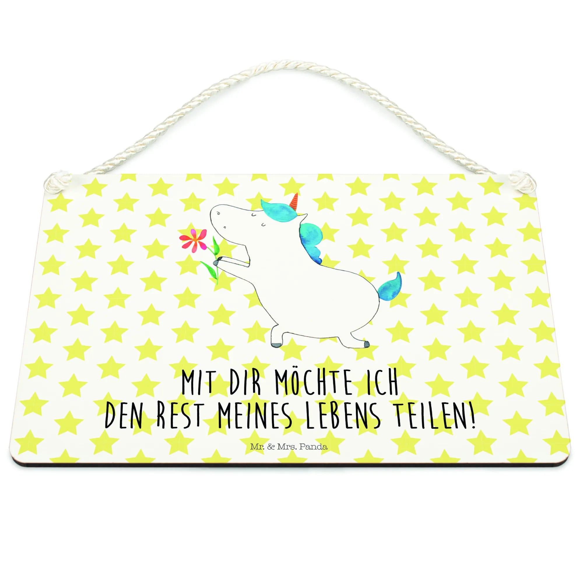Entdecke unser wunderschönes Deko Schild Einhorn Blume aus der zauberhaften Einhorn-Kollektion von Mr. & Mrs. Panda! Dieses Schild ist nicht nur eine entzückende Dekoration, sondern auch ein idealer Liebesbeweis für Dich und Deinen Partner. Der niedliche Spruch "Mit dir möchte ich den Rest meines Lebens teilen!" ziert das Schild und bringt die schönen Gefühle, die Du für Deinen Lieblingsmenschen hast, perfekt zum Ausdruck. Egal ob als Geschenk für einen Heiratsantrag, zur Verlobung oder einfach nur so, dieses Schild ist alles andere als gewöhnlich.